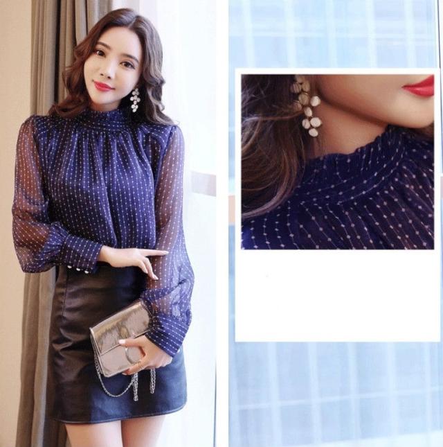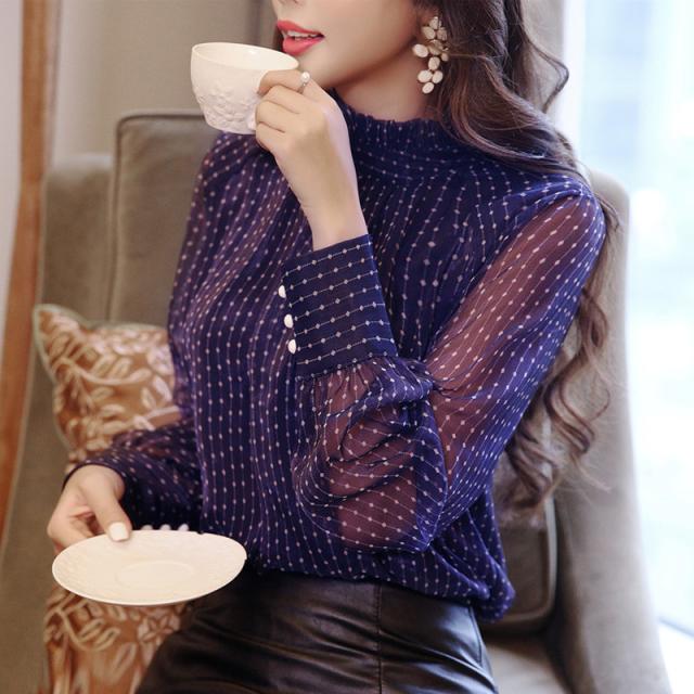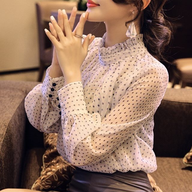 レディース トップス シャツ ブラウス 人気 通販 おすすめ シフォン ドット 水玉 シースルー 透け感 シアー 長袖 袖あり パフ袖 パフスリーブ フリル 立襟 スタンドカラー 大人女子 上品 大人 かわいい レディライク 通勤 通学 OL オフィス 女子会 お出かけ デート 旅行 休日