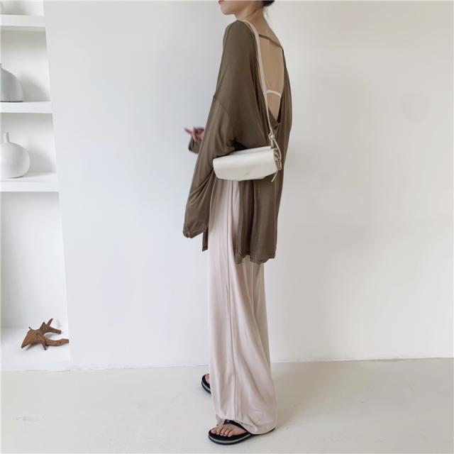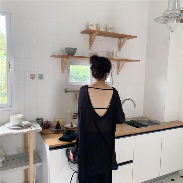 ルーズ セクシー レイジー ホルター トップス カットソー 人気 通販 おすすめ 袖あり 長袖 ラウンドネック ワイド スリット サイド 透け感 背中開き おしゃれ 大人女子 こなれ感 ラフ とろみ感 抜け感 無地 秋 20代 30代 デート お出かけ 旅行 女子会 休日 海 プール 韓国系