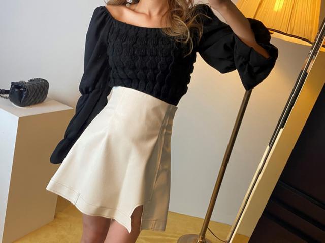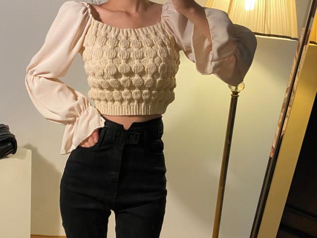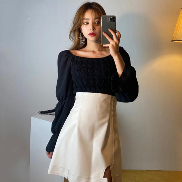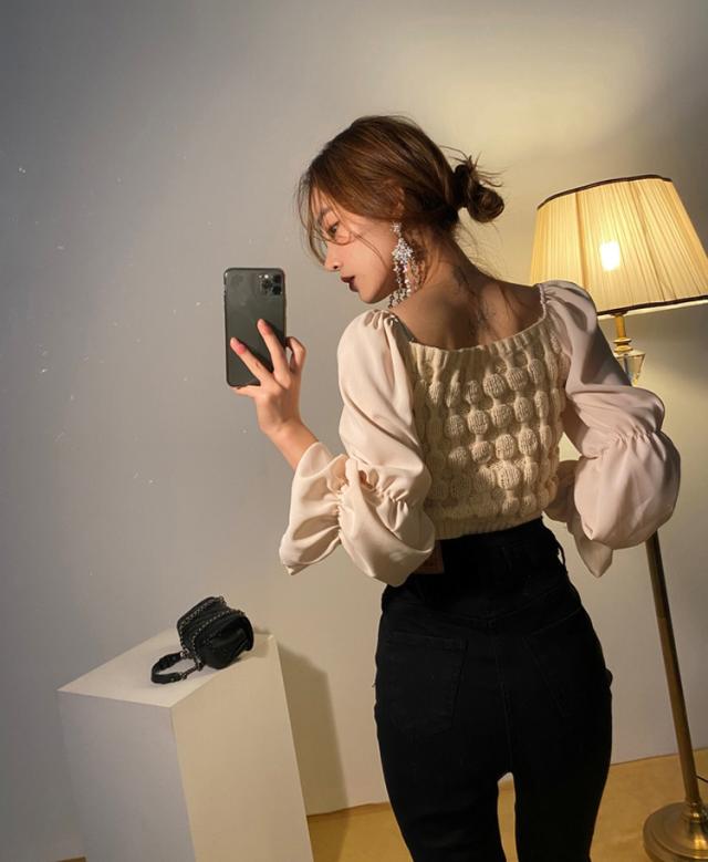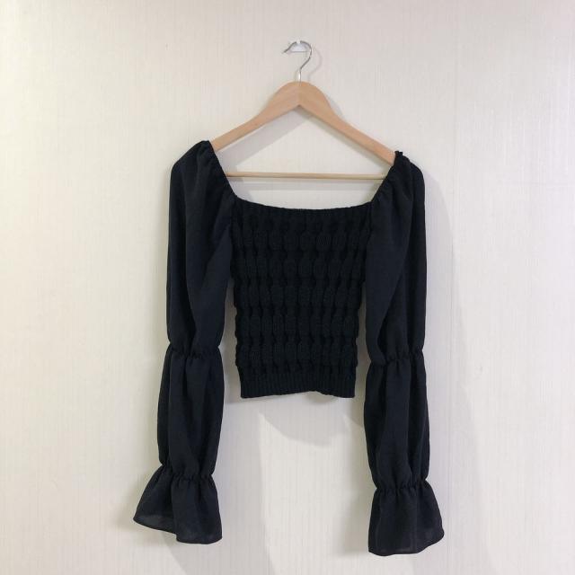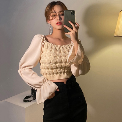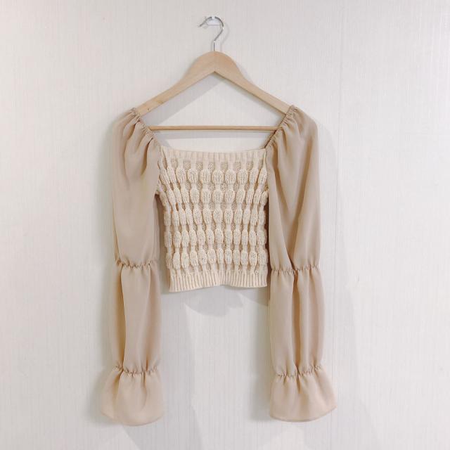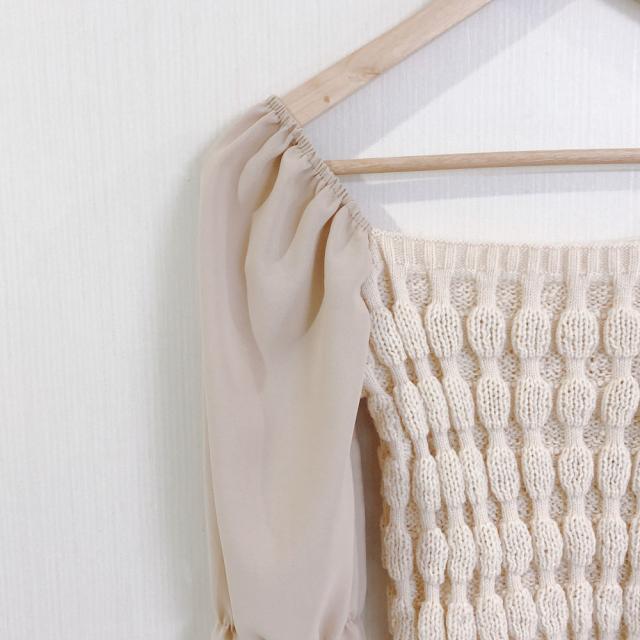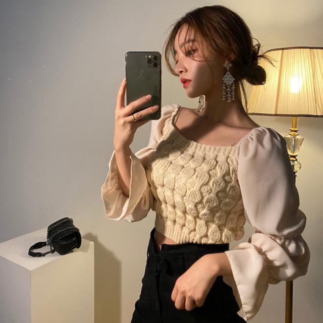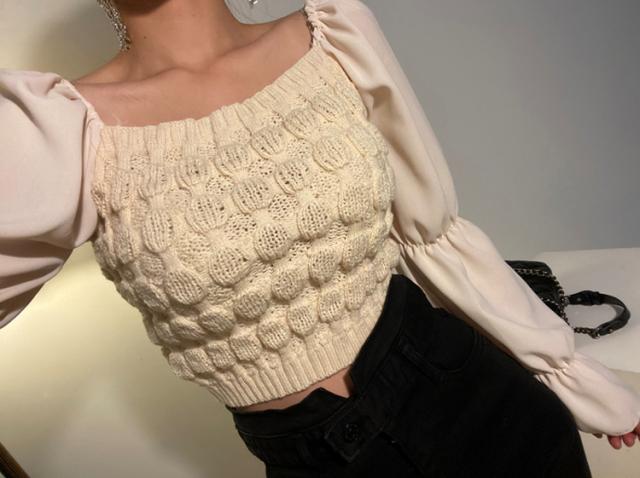 シフォンスリーブセーター トップス セーター ミニ ミニ丈 ショート ショート丈 袖あり 長袖 パフスリーブ キャンディースリーブ スクエアネック オフショルダー オフショル シフォン かわいい 大人可愛い きれいめ シンプル 大人可愛い 大人女子 ラブリー キュート ガーリー とろみ感 無地 春 秋 10代 20代 30代 オフィス ビジネス OL デート お出かけ 普段使い 韓国 韓国系 オルチャン フリーサイズ 白 ホワイト 黒 ブラック