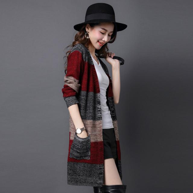 アウター 薄手 ニット カーディガン ウール Vネック ボーダー柄 配色 長袖 袖あり ミディアム ポケット付き 羽織 羽織り お洒落 おしゃれ ゆったり ルーズ 通勤 通学 大人 普段使い 着回し 普段着 お出かけ デート 旅行 休日 レディース 20代 30代 春 秋 M L XL 2XL 3XL ワインレッド ネイビー 紺 レッド 赤