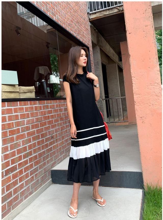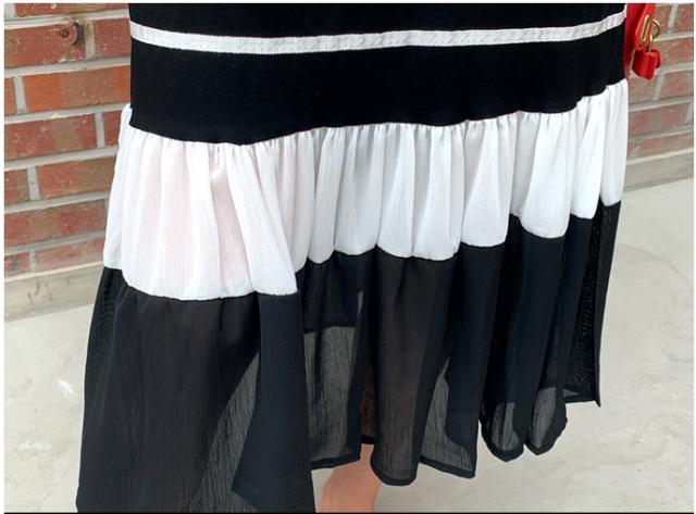 バイカラーフリルワンピース フレンチスリーブ 膝下丈 ミモレ丈 ドッキングデザイン フレア Aライン ドレス 大人可愛い カジュアル シンプル おしゃれ きれいめ ラフ お出かけ 女子会 旅行 リゾート バカンス おうちコーデ モノトーン 人気 トレンド