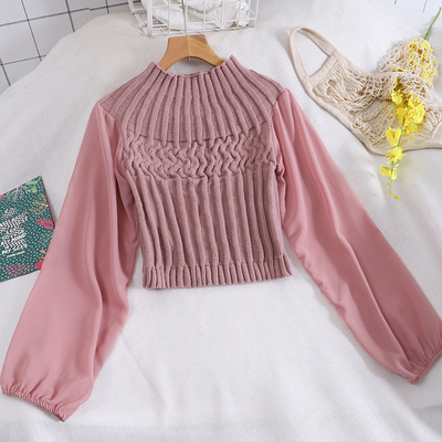 シフォンステッチセーター トップス セーター ショート ショート丈 袖あり 長袖 ボリューム袖 ハイネック シフォン 編み込み 透け感 シースルー ニット きれいめ シンプル 大人 上品 おしゃれ お洒落 ラブリー キュート ガーリー 無地 秋 10代 20代 30代 デート お出かけ 女子会 休日 着回し 普段使い フリーサイズ 白 ホワイト 黒 ブラック ピンク アプリコット