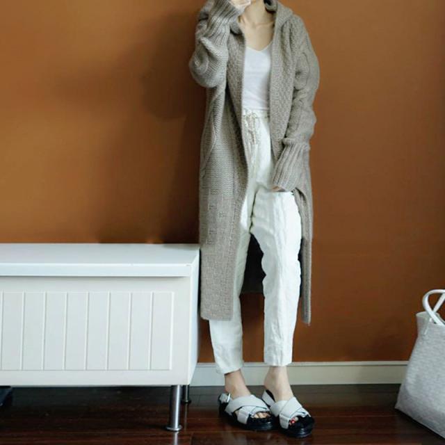 ニットコーディガン フード アウター ガウン ロング丈 マキシ 袖あり 長袖 萌袖 ふわふわ クロス編み 前開き ウール 大人可愛い ナチュラル シンプル カジュアル 上品 大人可愛い ラフ ラブリー キュート ガーリー ルーズ デート 秋 冬