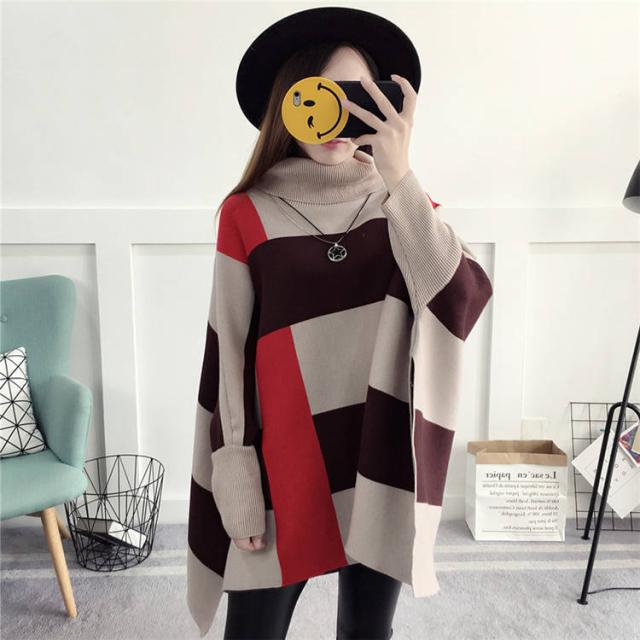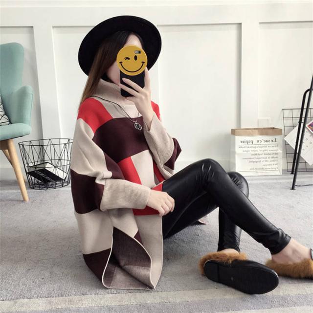 ポンチョ風 セーター レディース 秋 冬 暖かい 大判 ゆったり おしゃれ ハイネック タートルネック 大きめ 韓国 かわいい とっくり カジュアル マント ボリューム袖 サイドスリット チェック チュニック丈 大人 カジュアル ルーズ ゆる 個性的 お出かけ 休日 女子会 イベント