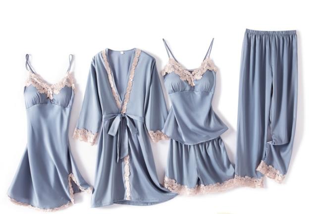 ナイトウェア レディース 長袖 パジャマ ルームウェア 寝間着 5点セット キャミソール ワンピース ショートパンツ ロングパンツ ラージカラー フリル カラバリ 上下 春 秋 可愛い 大人 女子 セクシー ガーリー キュート おうち時間 デート お泊まり XL 水色 ピンク 赤 紺