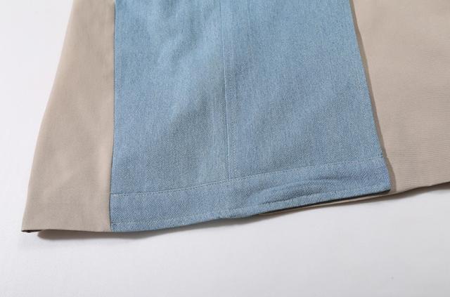 アウター トレンチコート デニム 異素材MIX ミドル丈 ダブルブレスト ロング コート ツートン ウエストマーク ウエストベルト 襟付き フロントボタン ポケット付き 大人 カジュアル 個性的 主役級 おしゃれ お洒落 デザイン 通勤 通学 学生 お出かけ デート 旅行 女子会 普段着 普段使い 休日 春 秋 ワンサイズ ベージュ × ライトブルー 水色