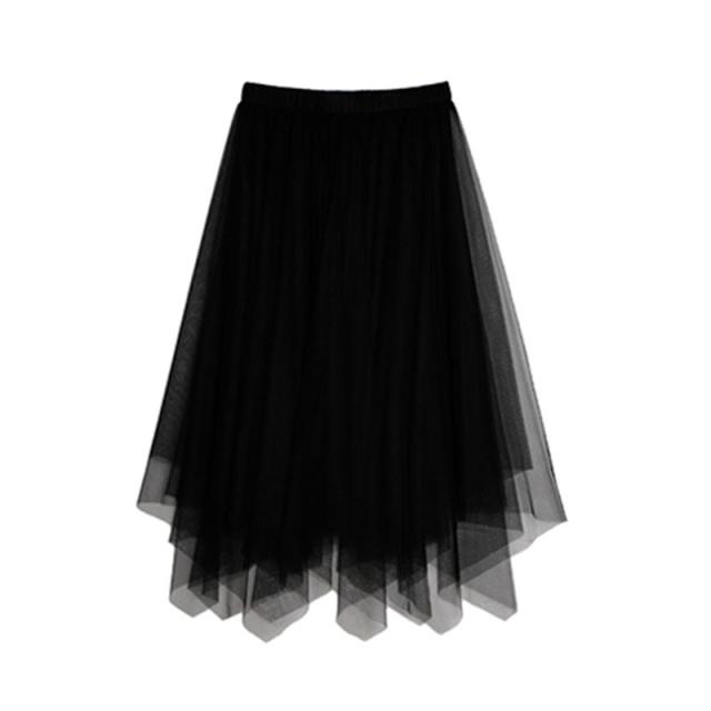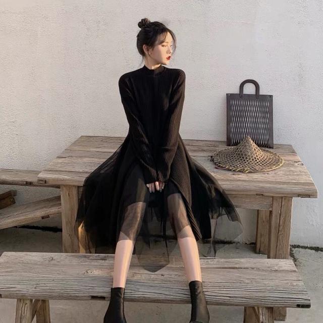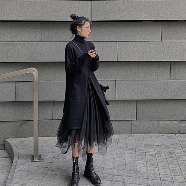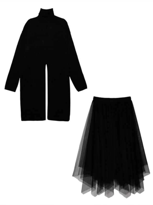 セットアップ 上下セット トップス ニット ロング 長袖 スカート ミディ丈 ミモレ丈 膝下 ハンカチヘム チュール 前後スリット 透け感 異素材 重ね着風 シンプル カジュアル おしゃれ フェミニン モード 通勤 通学 着回し 普段使い お出かけ デート 秋冬 春 ブラック 韓国系