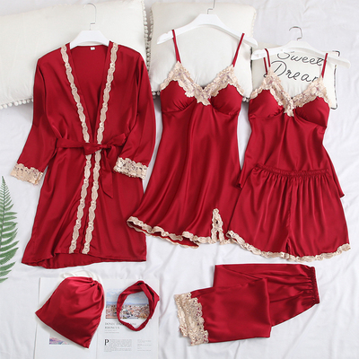 ナイトウェア ナイティ ランジェリー 7点セット パジャマ ルームウェア 部屋着 配色レース ガウン ウエストリボン キャミソール キャミワンピース ショートパンツ ロングパンツ ヘアバンド 巾着 3色展開 上下 羽織り お揃い 春 夏 秋 大人 セクシー お泊り 旅行 外泊 肌見せ