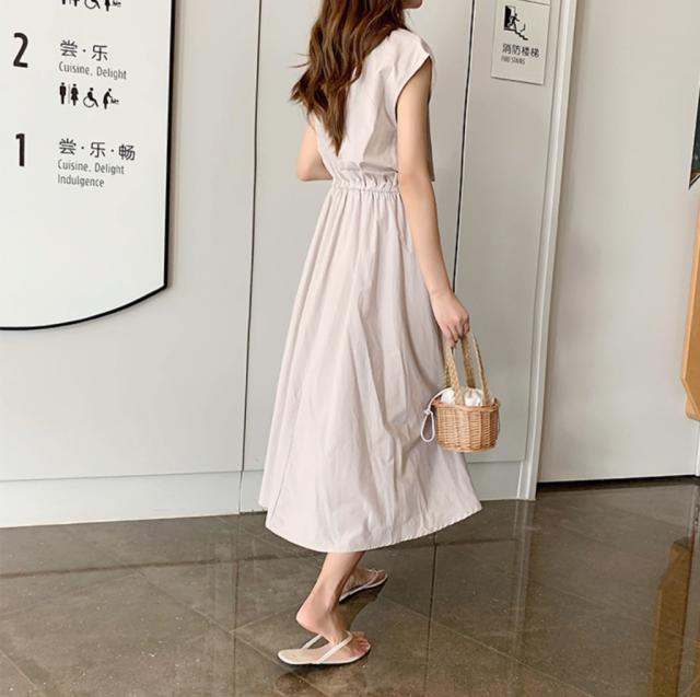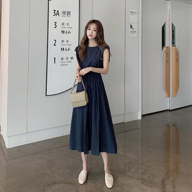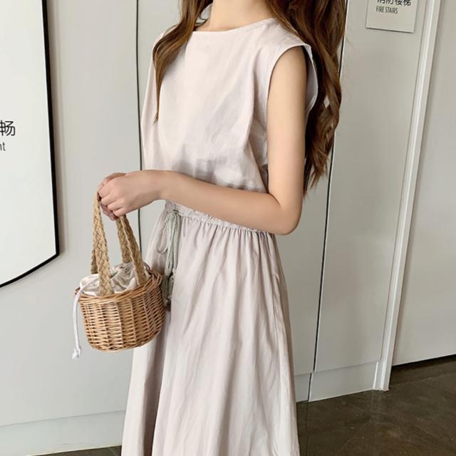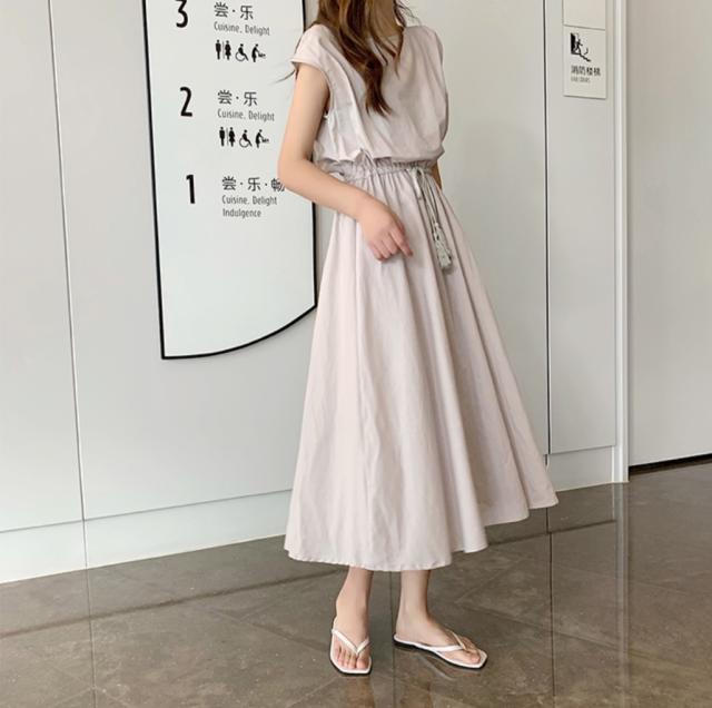 ワンピース レディース マキシ丈 ロング ラウンドネック ノースリーブ フレンチスリーブ ハイウエスト 切り替え 腰紐 タッセル シンプル 涼しげ リラクシー ゆったり ルーズ カジュアル お洒落 大人 可愛い 黒ベージュ 紺 休日 お出かけ デート 旅行 普段使い
