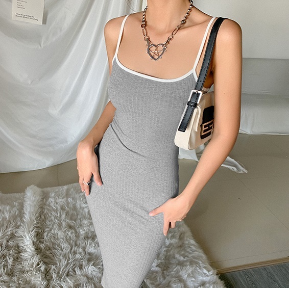 配色パイピンク リブニット キャミソール ワンピース レディース Iライン タイト ミディ丈 ミモレ丈 膝下 スリム フィット 細身 バイカラー配色 綿 コットン シンプル カジュアル セクシー おしゃれ 肌魅せ レイヤード 重ね着 普段使い デート おでかけ 黒 白 灰色 ピンク