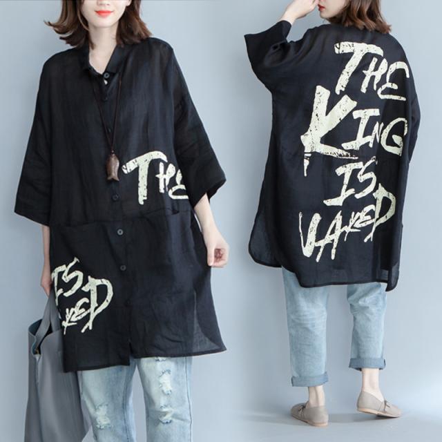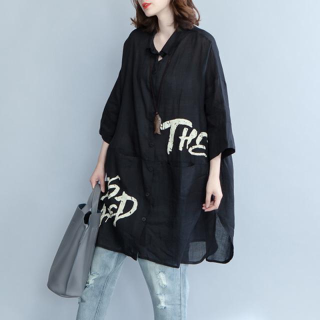 トップス ロング シャツ 襟付き フロントボタン 綿 コットン リネン 麻 薄い バックプリント 英字 レター プリント 羽織 羽織り 七分袖 7分袖 袖あり ポケット付き 大きめ ゆったり ルーズ 体型カバー おしゃれ お洒落 こなれ感 通勤 通学 お出かけ デート 旅行 休日 普段使