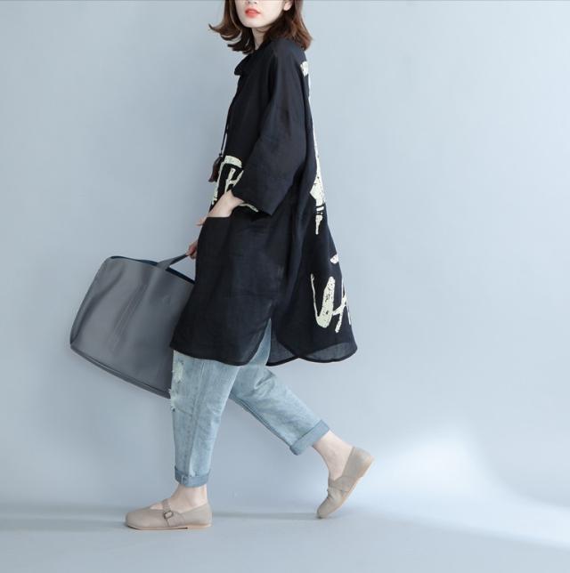 トップス ロング シャツ 襟付き フロントボタン 綿 コットン リネン 麻 薄い バックプリント 英字 レター プリント 羽織 羽織り 七分袖 7分袖 袖あり ポケット付き 大きめ ゆったり ルーズ 体型カバー おしゃれ お洒落 こなれ感 通勤 通学 お出かけ デート 旅行 休日 普段使い レディース 春 夏 大きいサイズ XL 2XL ブラック 黒