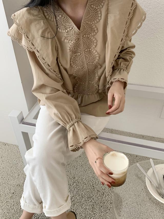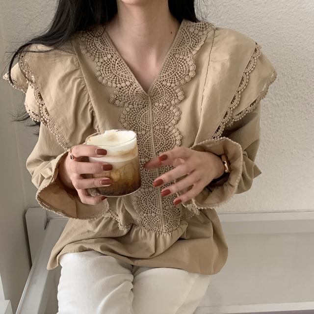 ?Xネックフリルブラウス トップス ブラウス 袖あり 長袖 ボリューム袖 Vネック レース フリル かわいい 大人可愛い きれいめ シンプル カジュアル おしゃれ お洒落 大人可愛い 大人女子 こなれ感 ラブリー キュート ガーリー 無地 春 夏 秋 10代 20代 30代 レディース 学生 通学 デート お出かけ 女子会 休日 着回し 普段使い 韓国 韓国系 オルチャン 色展開 ベージュ カーキ