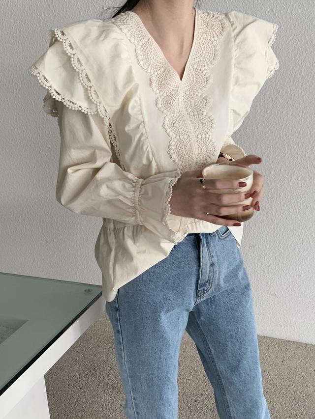 Vネックフリルブラウス トップス ブラウス 袖あり 長袖 ボリューム袖 Vネック レース フリル かわいい 大人可愛い きれいめ シンプル カジュアル おしゃれ お洒落 大人可愛い 大人女子 こなれ感 ラブリー キュート ガーリー 無地 春 夏 秋 10代 20代 30代 レディース 学生 通