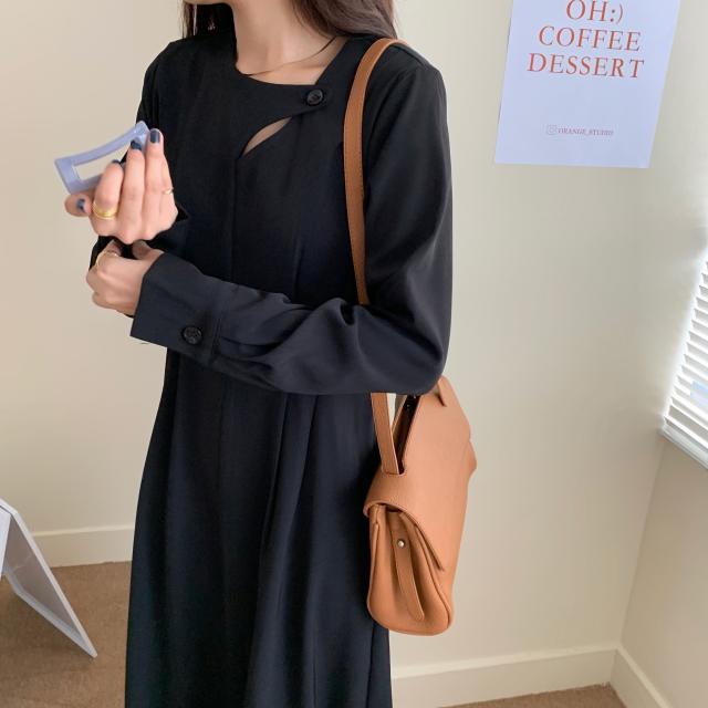 イレギュラーネックワンピース ワンピース フレアワンピース ロング ロング丈 袖あり 長袖 フレア ベルト ウエストマーク ハイウエスト ポリエステル かわいい 大人可愛い きれいめ シンプル カジュアル おしゃれ お洒落 大人可愛い 大人女子 こなれ感 無地 春 夏 秋 10代 20