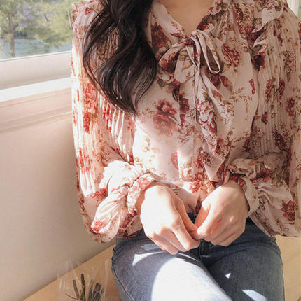 レトロっぽく女性らしい着こなしができる花柄ボウタイブラウス♪