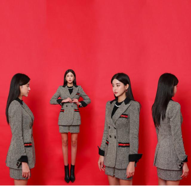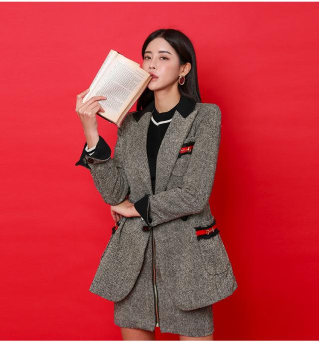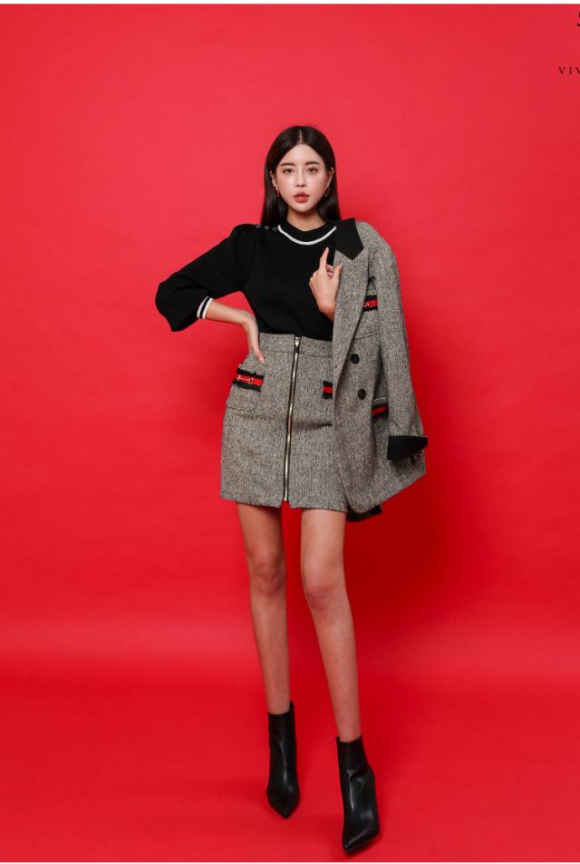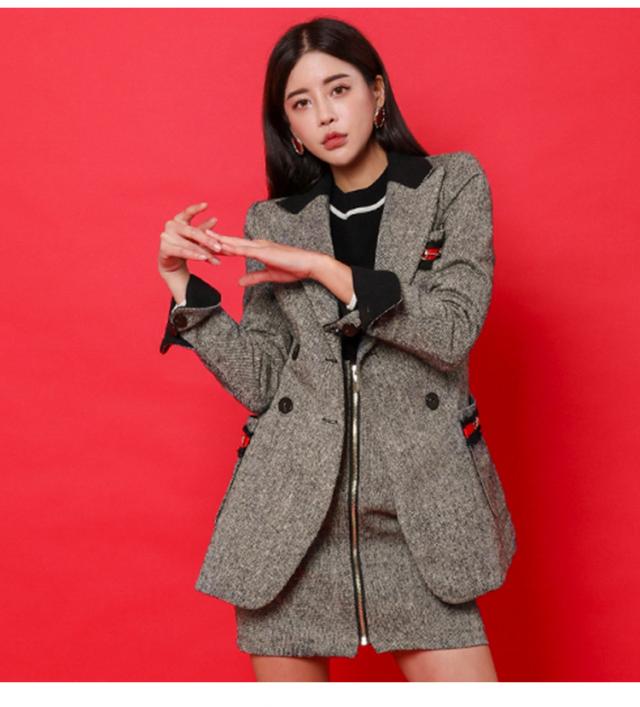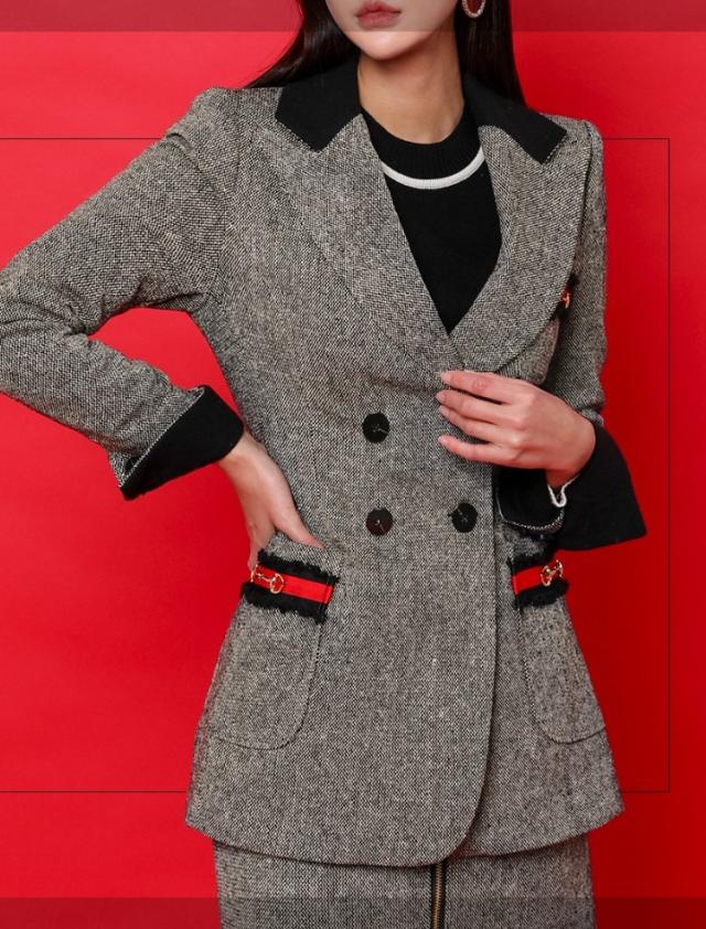 ツイード調 セットアップ スカートスーツ 上下 2点セット レディース 配色 ライン ビット装飾 ジャケット テーラードカラー ダブルボタン 長袖 タイトスカート フロントジッパー ミニ丈 膝上 スリム きれいめ 大人 上品 おしゃれ かっこいい クール モード系 デート 灰色