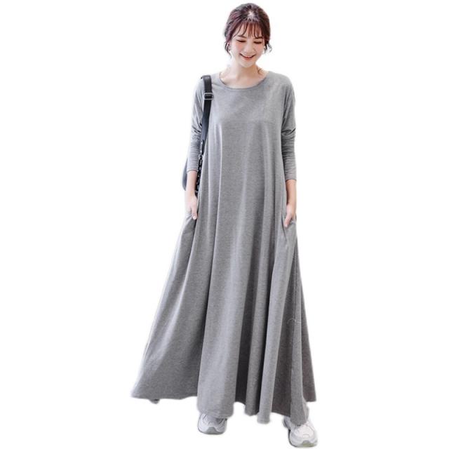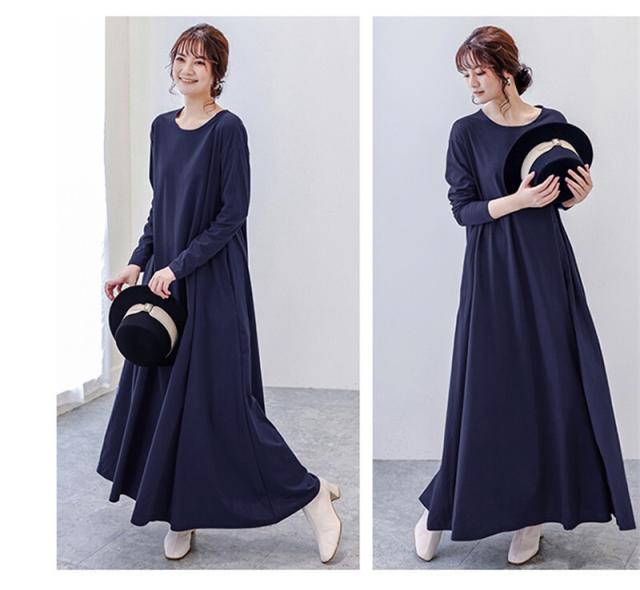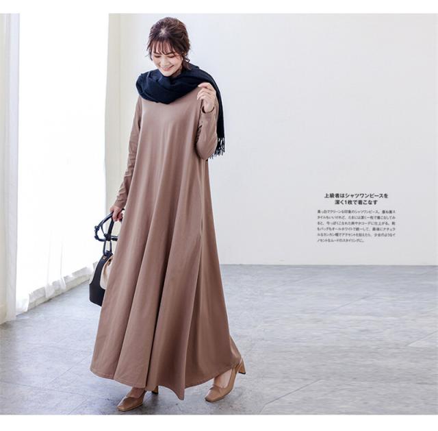 カットソーフレアワンピース レディース ロング丈 マキシ丈 袖あり 長袖 ラウンドネック Aライン 綿 かわいい 大人女子 きれいめ ナチュラル シンプル カジュアル おしゃれ こなれ感 とろみ感 おうちコーデ おうち時間 無地 オールシーズン お出かけ 旅行