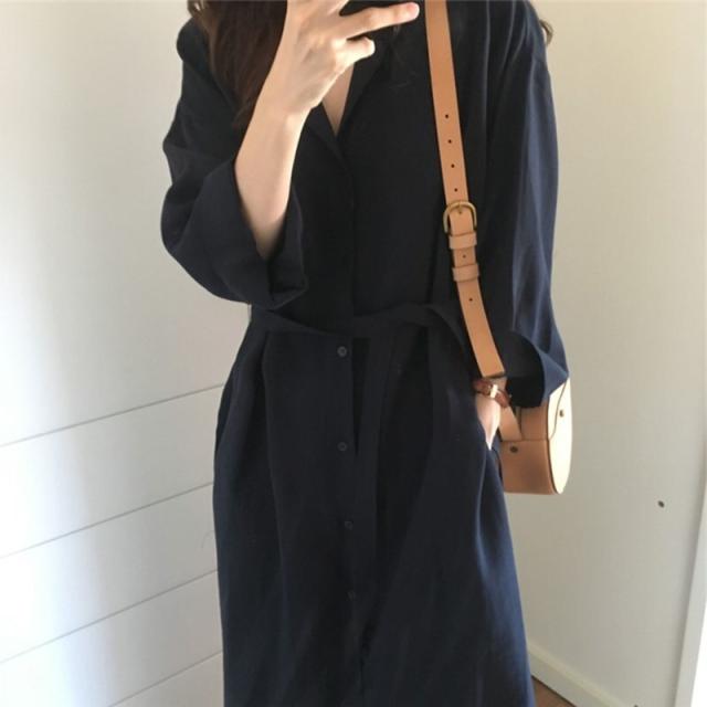 開襟 シャツワンピース 2way 羽織りもの レディース ワンピ ミモレ丈 ロング丈 テーラードカラー Vネック 襟付き 七分袖 ゆったり リボンベルト ウエストマーク 前開き 体型 カバーシンプル カジュアル 大人 可愛い 上品 こなれ感 シック 無地 春 秋 大きいサイズ 2XL 黒 茶