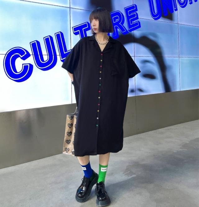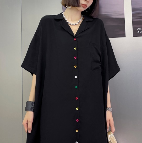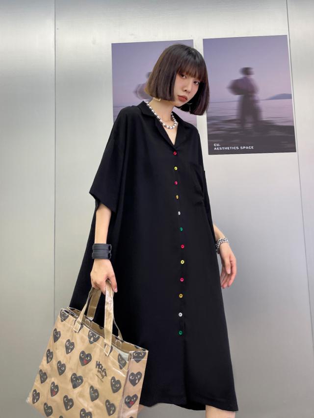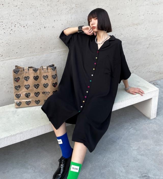 ルーズフィット オーバーサイズ カラフルボタン オープンカラー シャツワンピース レディース ミディ丈 開襟 Vネック 半袖 袖あり フロントボタン 前開き ゆったり ゆるめ 体型 カバー シンプル カジュアル 個性的 おしゃれ クール 大人 かっこいい モード 大きいサイズ 黒