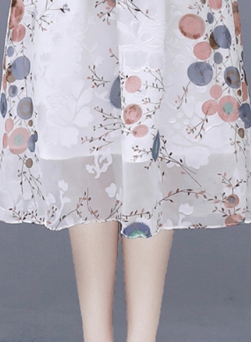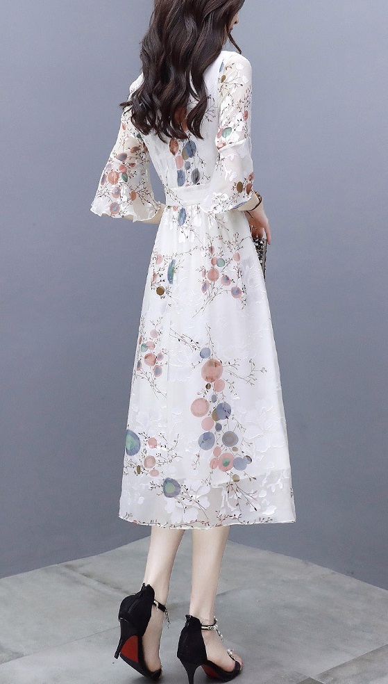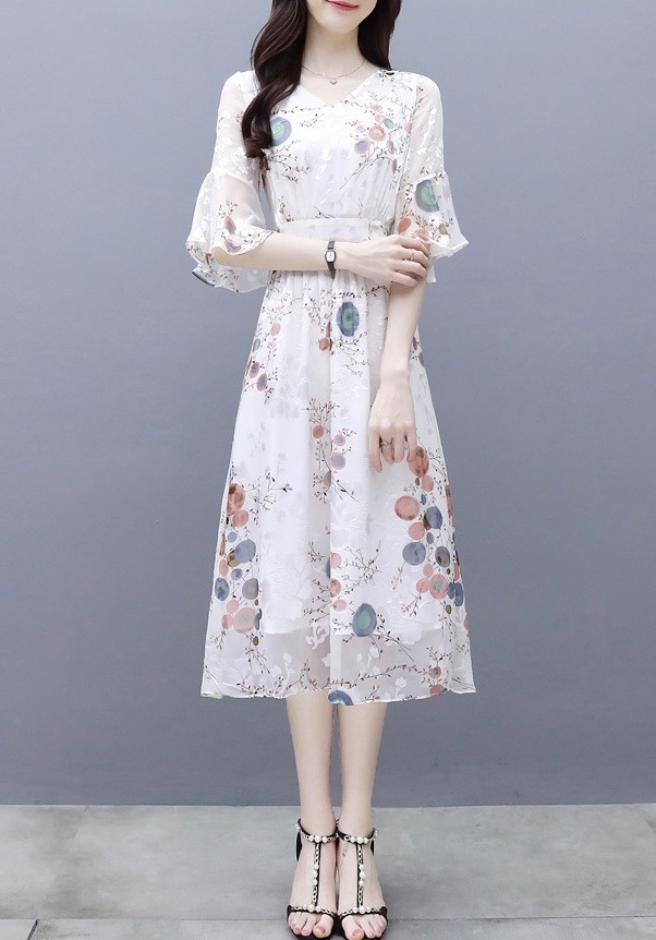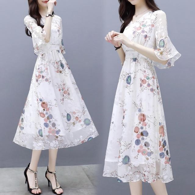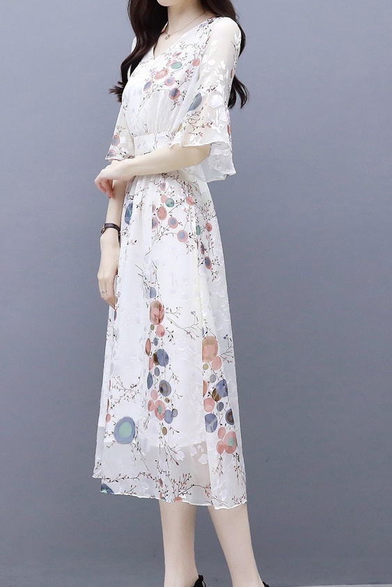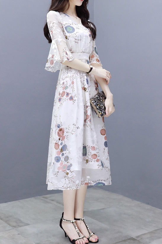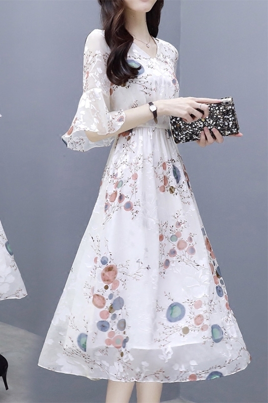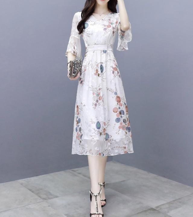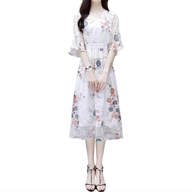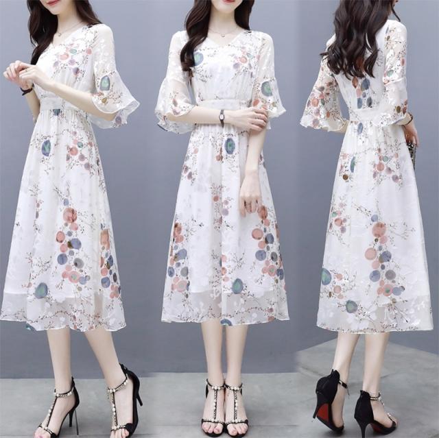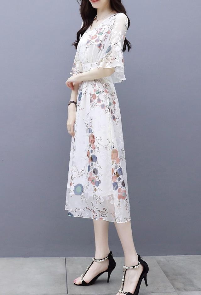 ワンピース 花柄 サマーワンピ 半袖 袖あり 5分袖 五分袖 フレア袖 フレアスリーブ ふんわり フレア シースルー 透け感 Aライン Vネック ハイウエスト 切り替え ウエストゴム 伸縮性 ロング ミディ丈 膝下 ひざ下 大人可愛い かわいい 可愛い フェミニン スイート ラブリー おしゃれ お洒落 大人女子 通勤 通学 お出かけ デート 旅行 休日 普段使い 10代 20代 夏 レディース 大きいサイズ S M L XL 2XL ホワイト 白