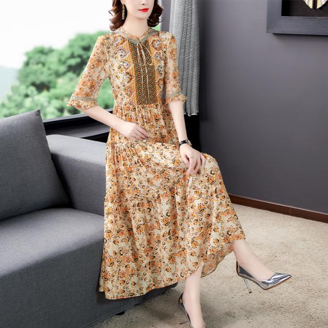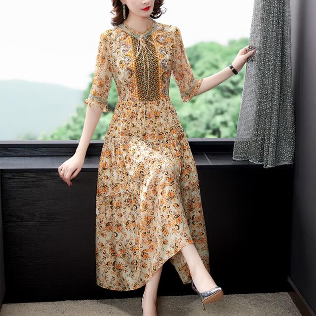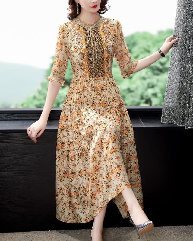 サマーワンピ フローラル ワンピース ロング ミモレ丈 半袖 袖あり 小花柄 花柄 ハイウエスト 切り替え ラウンドネック フロントリボン リボン結び フリル Aライン ドレープ 華やか 主役級 大人 上品 エレガント おしゃれ お洒落 通勤 お出かけ デート 旅行 休日 普段使い 30代 40代 50代 夏 レディース 大きいサイズ M L XL 2XL 3XL イエロー 黄色