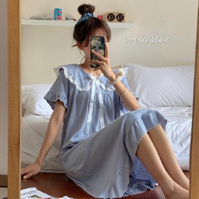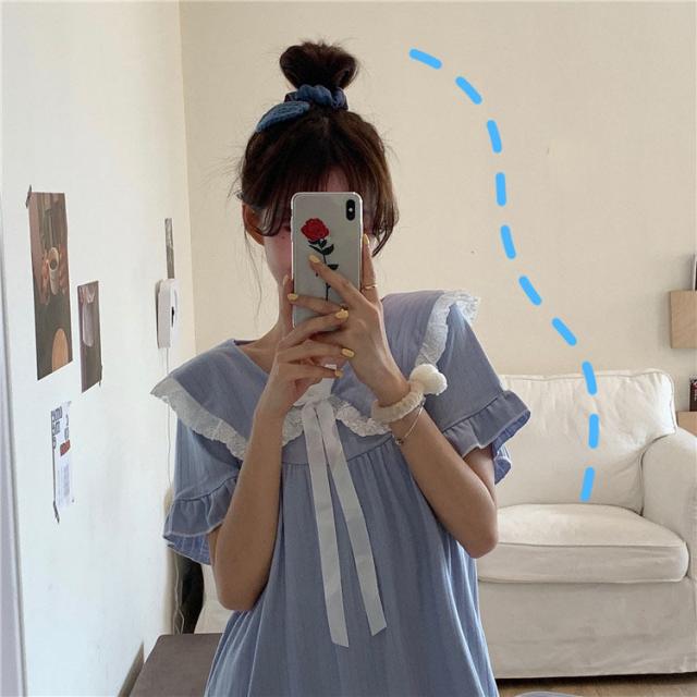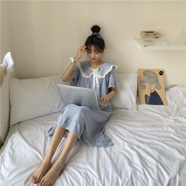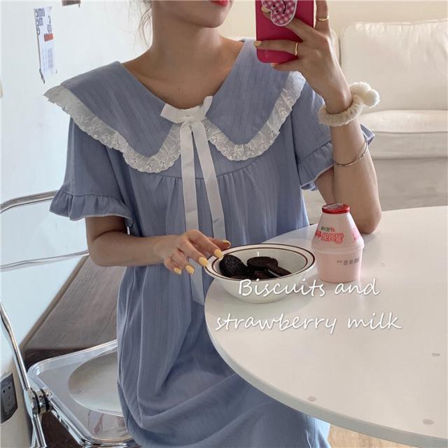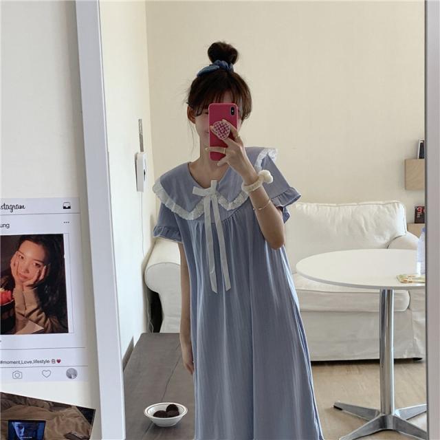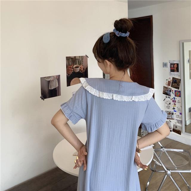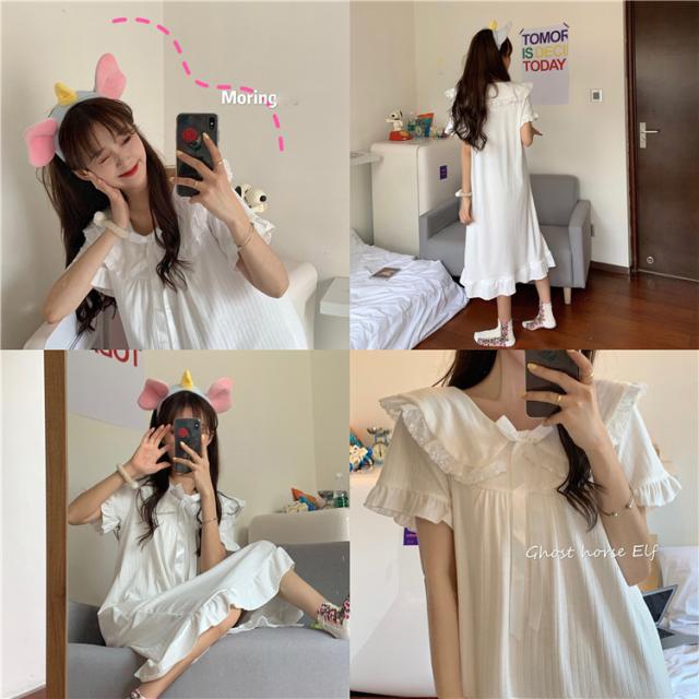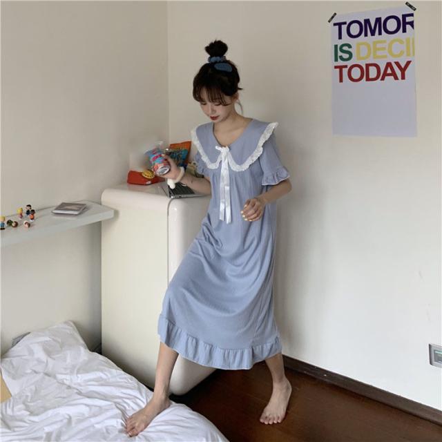 パジャマワンピース ルームウェア パジャマ 部屋着 寝巻き ナイトウェア ネグリジェ 膝下 ミモレ ミモレ丈 ミディアム丈 袖あり 半袖 Uネック 襟付き フリル リボン かわいい 大人可愛い 大人可愛い ラブリー キュート ガーリー ルーズ 無地 春 夏 10代 20代 30代 レディース 女子会 お泊まり 休日 普段使い 韓国 韓国系 オルチャン 色展開 白 ホワイト 青 ブルー