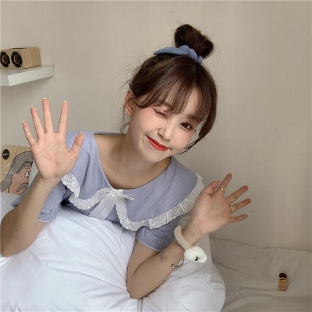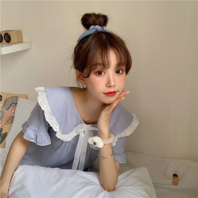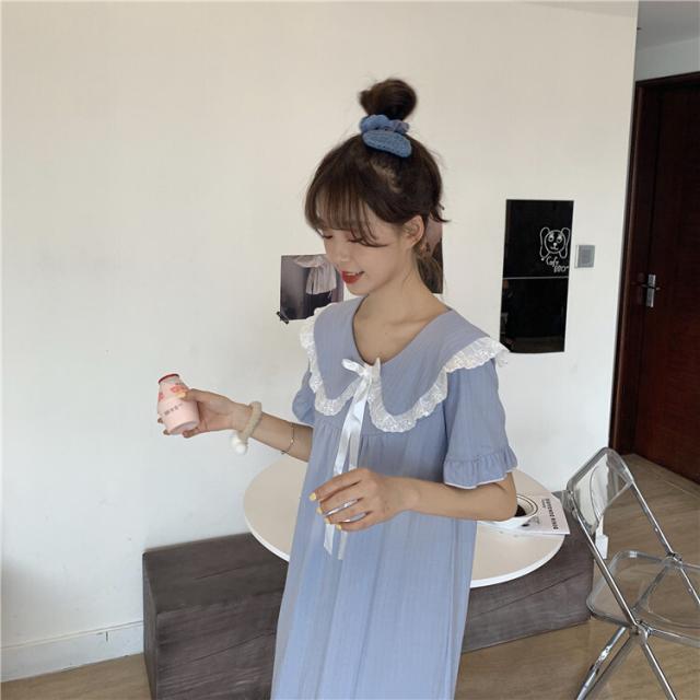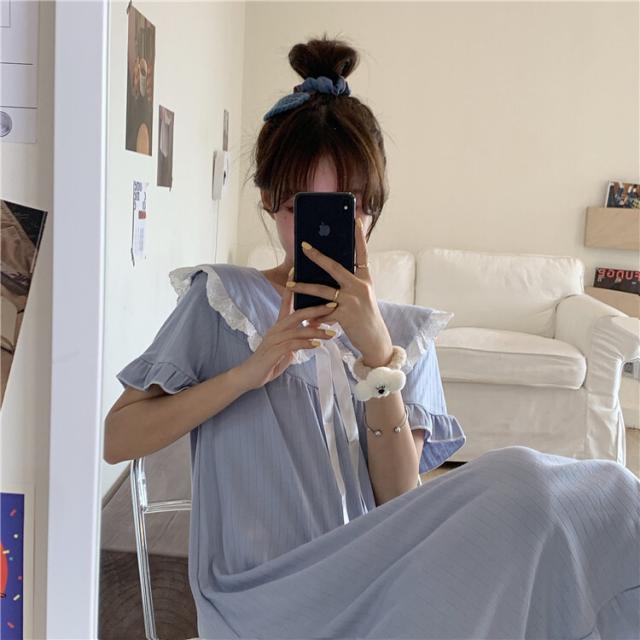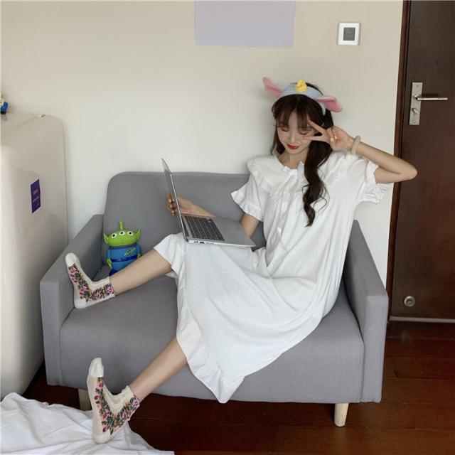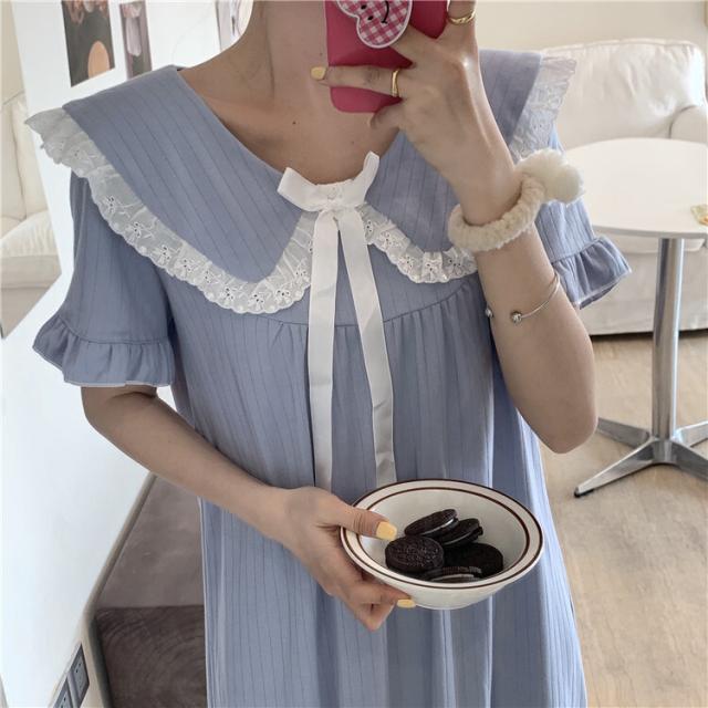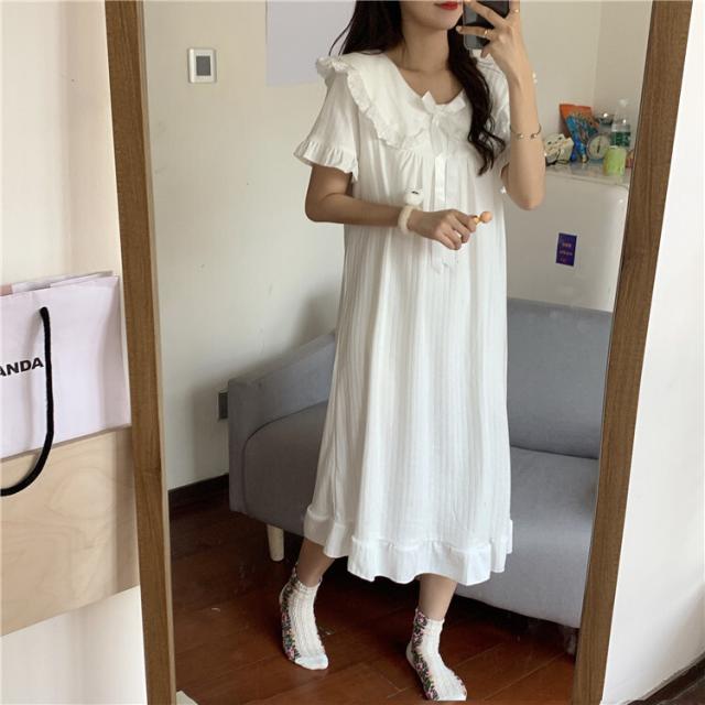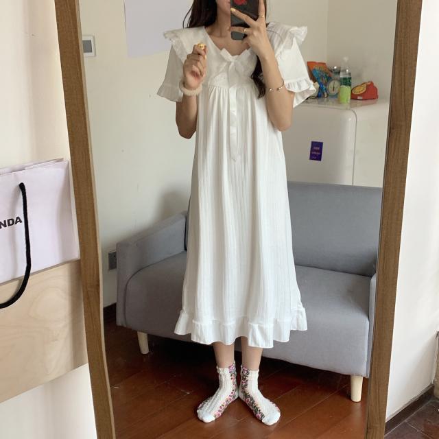 パジャマワンピース ルームウェア パジャマ 部屋着 寝巻き ナイトウェア ネグリジェ 膝下 ミモレ ミモレ丈 ミディアム丈 袖あり 半袖 Uネック 襟付き フリル リボン かわいい 大人可愛い 大人可愛い ラブリー キュート ガーリー ルーズ 無地 春 夏 10代 20代 30代 レディース 女子会 お泊まり 休日 普段使い 韓国 韓国系 オルチャン 色展開 白 ホワイト 青 ブルー