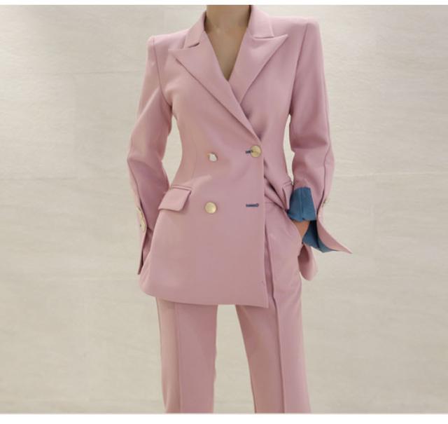 スーツ ジャケット パンツ セットアップ 袖あり 長袖 襟付き 切り替えデザイン ボタン 上下セット 2点セット ツーピース セットアイテム シンプル 大人 上品 おしゃれ お洒落 かっこいい 二次会 参観日 20代 30代 40代 レディース 韓国 韓国系 オルチャン ファッション S M L XL ブルー ピンク バイカラー