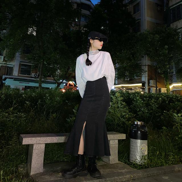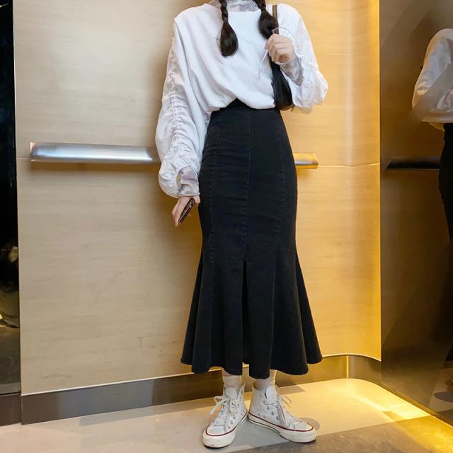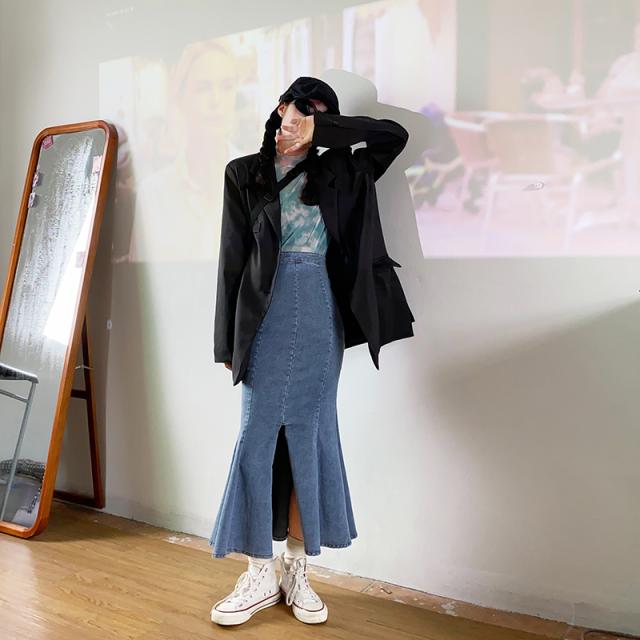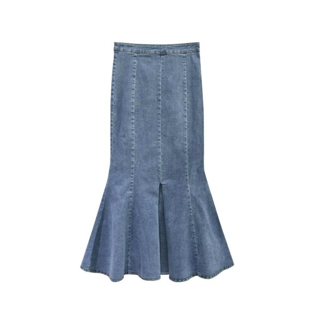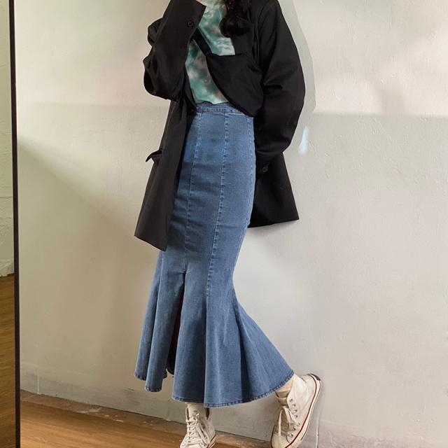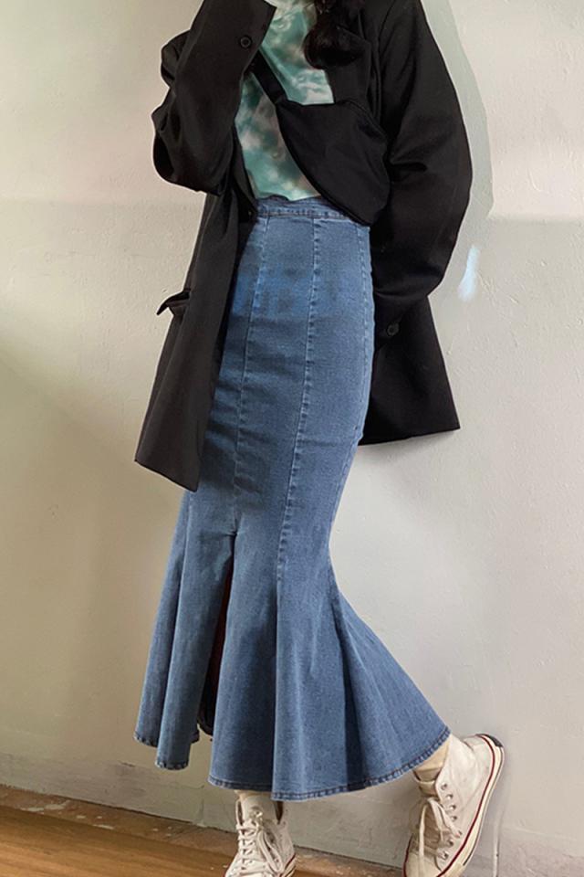 ミドル丈スカート スカート ボトムス ロングスカート タイトスカート デニムスカート 膝下 ミディアム丈 ミドル丈 マーメイド ハイウエスト フリル スリット デニム ブルーデニム カラーデニム 無地 春 秋 冬 10代 20代 レディース デート お出かけ 女子会 休日 普段使い 韓国 韓国系 オルチャン ファッション M L XL 2XL 3XL 4XL 大きいサイズ ブラック ブルー