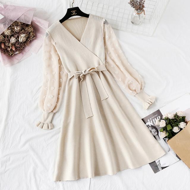 ニット ワンピース レディース フレア ワンピース 袖シースルー 袖あり チュール袖 異素材 Vネック Aライン シフォン ウエストリボン 大人 可愛い きれいめ シンプル ラブリー ガーリー ドット柄 水玉 黒 ベージュ ピンク 韓国 オルチャン 春 夏 秋 デート お出かけ