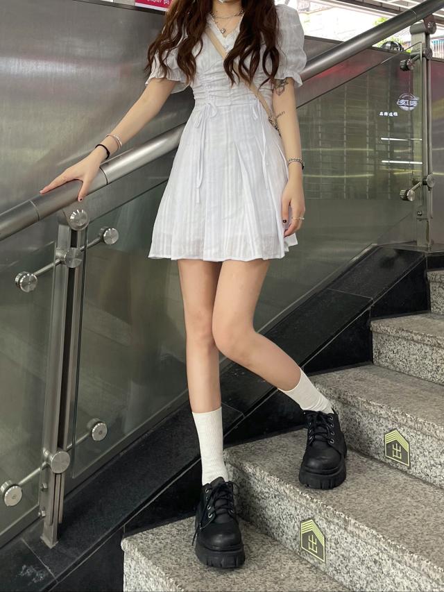 ワンピース ミニワンピース ミニ ミニ丈 ショート ショート丈 膝上 袖あり 半袖 パフスリーブ Vネック 切り替えデザイン プリーツ ウエストマーク 綿 かわいい 大人可愛い カジュアル おしゃれ お洒落 無地 春 夏 10代 20代 学生 デート お出かけ 女子会 休日 リゾート 旅行 海 プール 韓国 韓国系 オルチャン ファッション 楽ちん S M L ホワイト