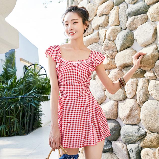 水着 レディース ワンピース 体型カバー 着痩せ ウエスト 細見え パンツ一体型 スクエアネック ギャザー シャーリング バックリボン 袖あり フレンチスリーブ フリル フレア スカート ワイヤーなし パッド付き シンプル 黒 赤 ワインレッドチェック柄 夏 ビーチ 海 プール