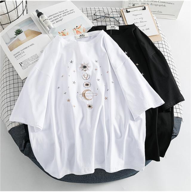 刺繍Tシャツ 星 宇宙 トップス Tシャツ 白トップス 袖あり 半袖 ラウンドネック 刺繍 綿 かわいい 大人可愛い きれいめ シンプル カジュアル おしゃれ お洒落 キュート ガーリー 個性的 無地 春 夏 10代 20代 30代 レディース 学生 通学 デート お出かけ 公園デビュー 女子会 休日 着回し 普段使い 重ね着 韓国 韓国系 オルチャン ファッション サイズ M L XL 2XL 色展開 白 ホワイト 黒 ブラック