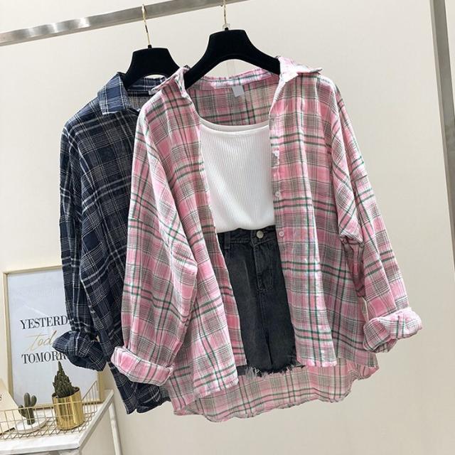 長袖チェックシャツ トップス シャツ 袖あり 襟付き 前開き ポリエステル かわいい 大人可愛い シンプル カジュアル おしゃれ お洒落 ラフ とろみ感 チェック柄 春 夏 秋 10代 20代 30代 レディース 学生 通学 デート お出かけ 公園デビュー 女子会 休日 着回し 普段使い 韓国 韓国系 オルチャン サイズ S M L XL 2XL 色展開 ピンク ネイビー