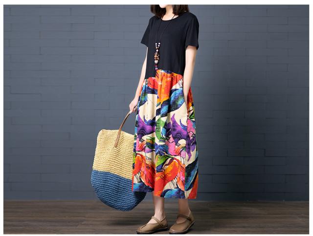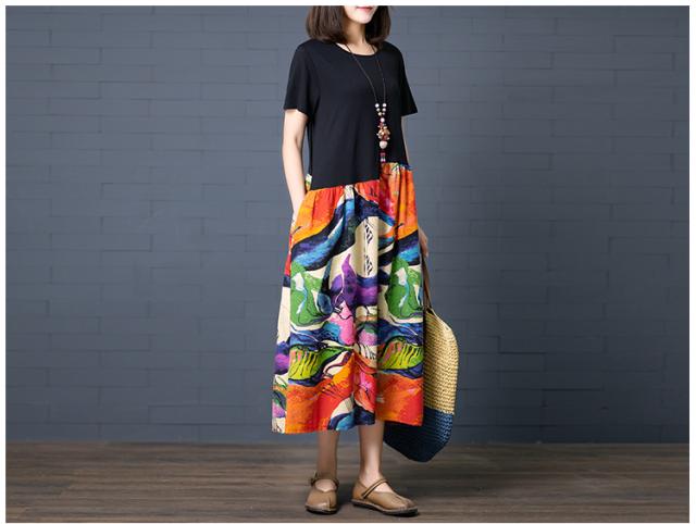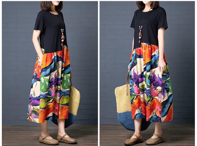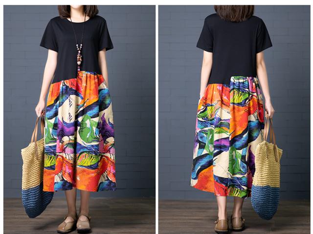 ゆったり アンバランス 切り替え カラフル ワンピース レディース 半袖 無地×アート調プリント ラウンドネック ミモレ丈 ロング丈 膝下 セミフレア ポケット付き ウエストギャザー 体型 カバー サマードレス 春 夏 個性的 カジュアル 大人 可愛い おうちウエア らくちん