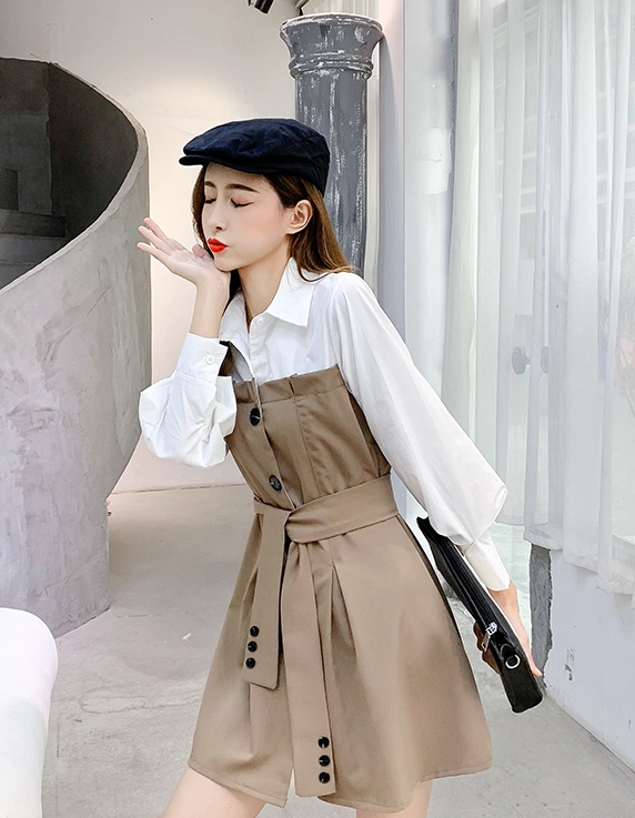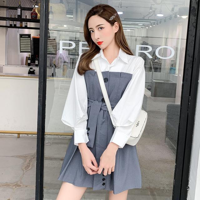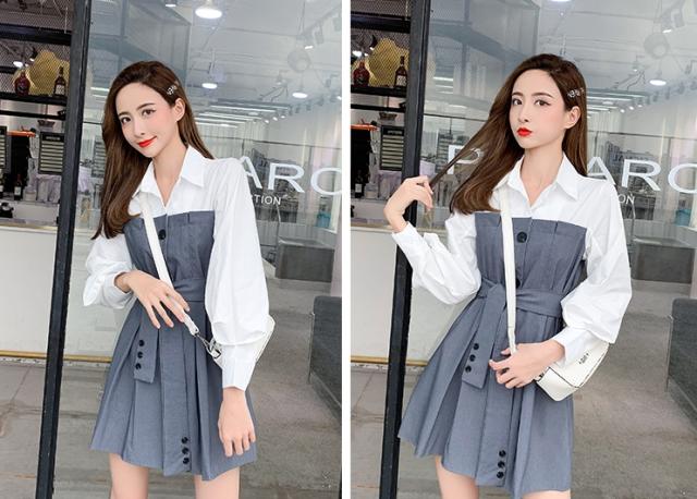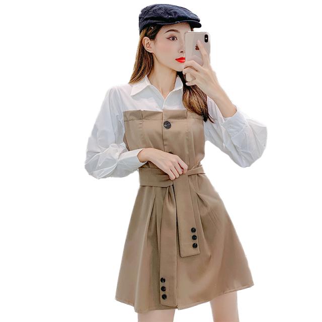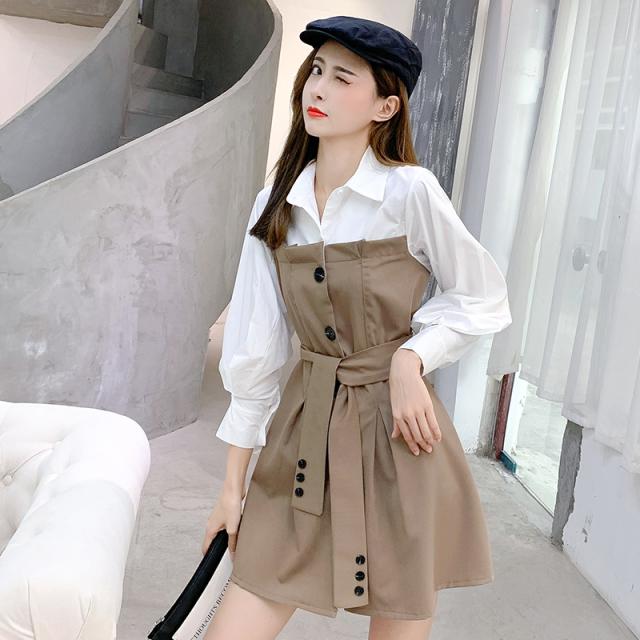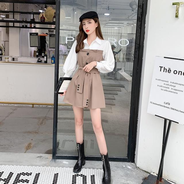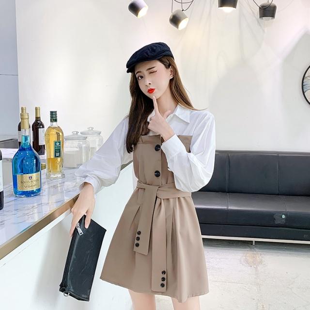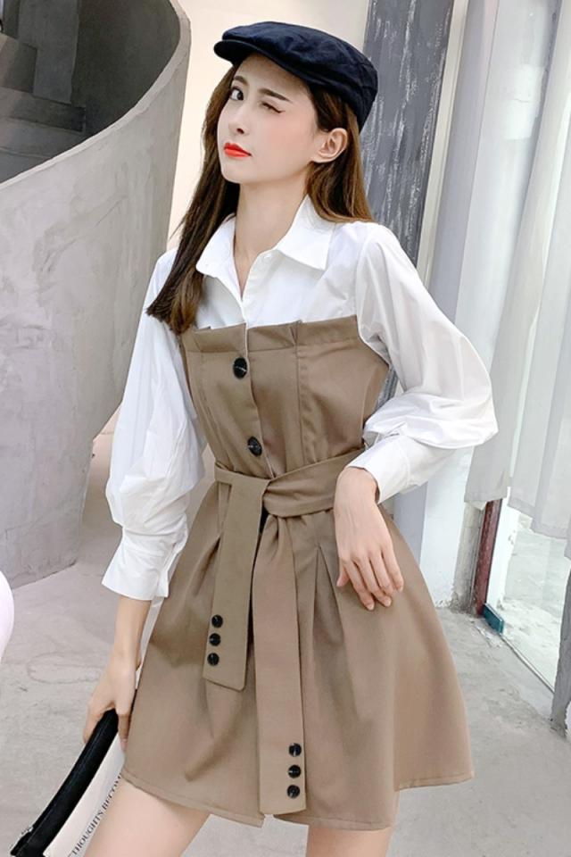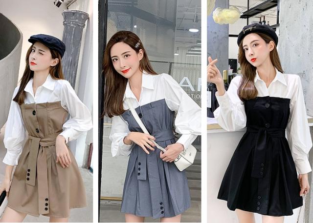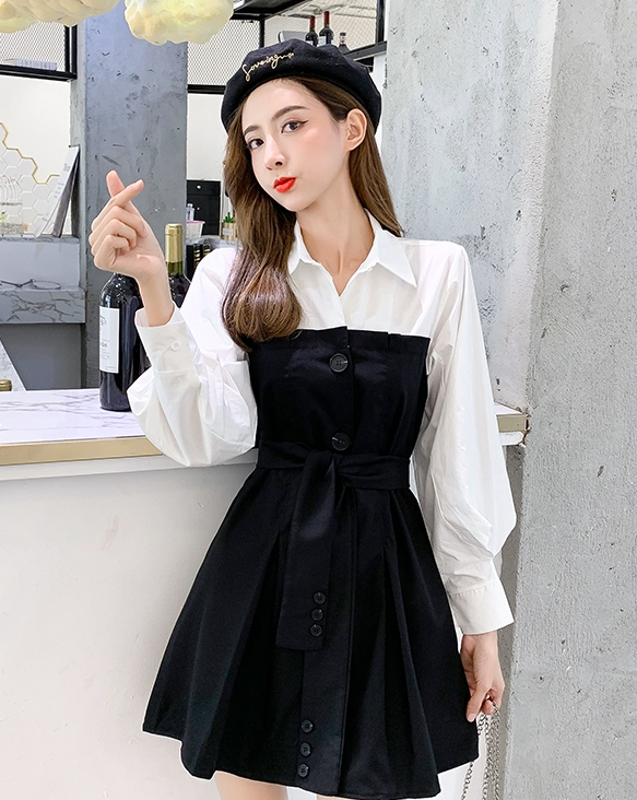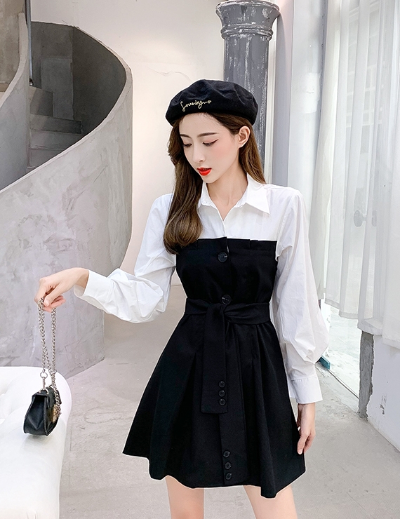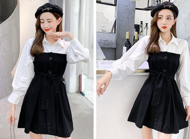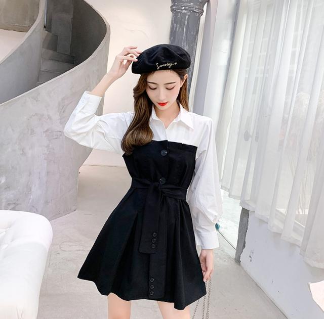 バイカラー ドッキング シャツワンピース ビスチェレイヤード風 異素材MIX 切り替え レディース フレア ミディ丈 膝上 ひざ丈 長袖 襟付き 重ね着調 ベルト ウエストマーク 綿 シンプル カジュアル きれいめ 上品 大人 可愛い おしゃれ デート お出かけ 通学 学生 モノトーン