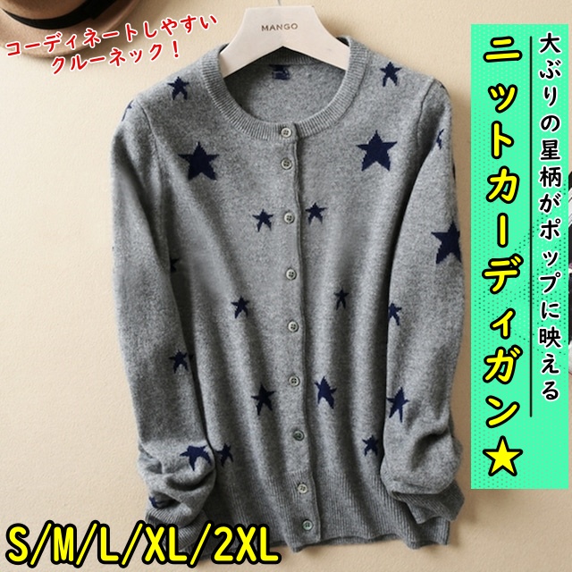 星柄ニットカーディガン トップス カーディガン 袖あり 長袖 クルーネック 前開き かわいい 大人可愛い シンプル カジュアル おしゃれ お洒落 大人可愛い 大人女子 柄 春 夏 秋 10代 20代 30代 レディース 学生 通学 デート お出かけ 公園デビュー 女子会 休日 着回し 普段使い 重ね着 韓国 韓国系 オルチャン サイズ S M L XL 2XL 灰色 グレー