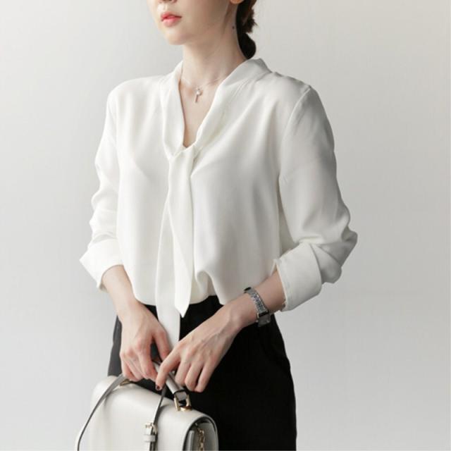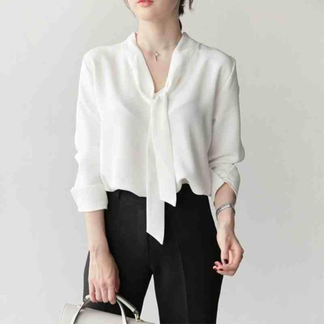 レディース トップス シフォン シャツ ブラウス 人気 通販 ボウタイ 長袖 袖あり Vネック 襟なし 無地 シンプル ゆったり ルーズ 大きめ スリット 大人 上品 エレガント フォーマル おしゃれ きちんと感 通勤 通学 大人女子 OL オフィス おでかけ デート 着回し 20代 30代