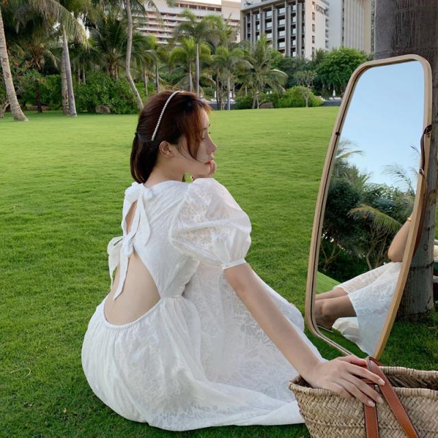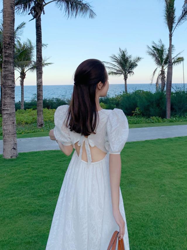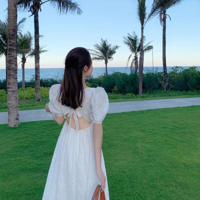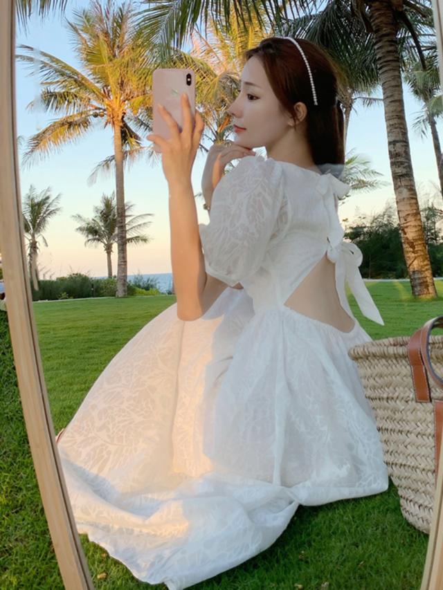 シアーボタニカル柄 バックオープン パフスリーブ ワンピース サマードレス レディース Aライン ミディ丈 ミモレ丈 膝下 葉柄 花柄 ボリュームスリーブ 半袖 透け感 スクエアネック バックリボン結び 背中魅せ ハイウエスト クラシカル シンプル 大人可愛い 上品 リゾート 白