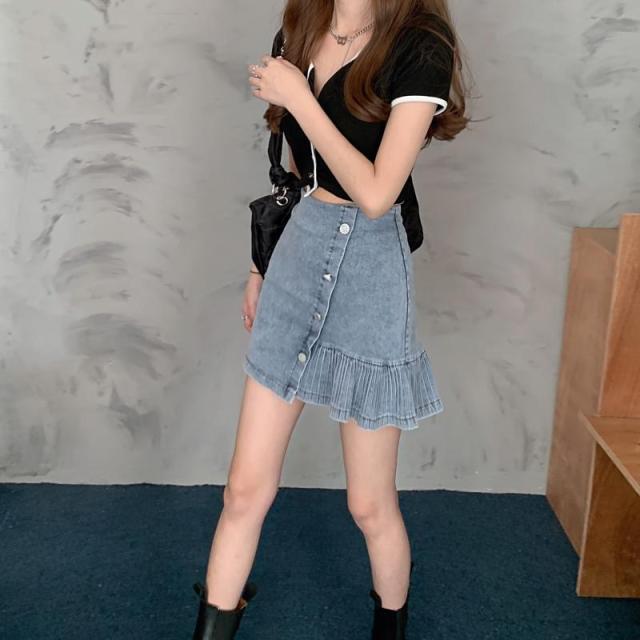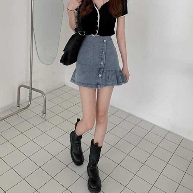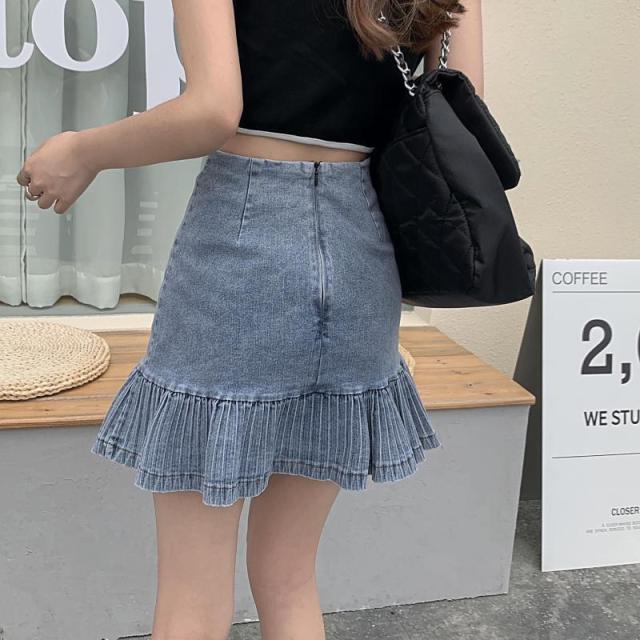 レディース デニム スカート 人気 通販 おすすめ ハイウエスト 膝上丈 ミニ丈 Aライン 個性的 スリム フリル プリーツ加工 ボトムス 春 夏 大人 可愛い カジュアル コーデ ガーリー ストリート系 ガーリー 甘辛ミックス 通学 学生 大学生 キャンパス デート お出かけ 旅行