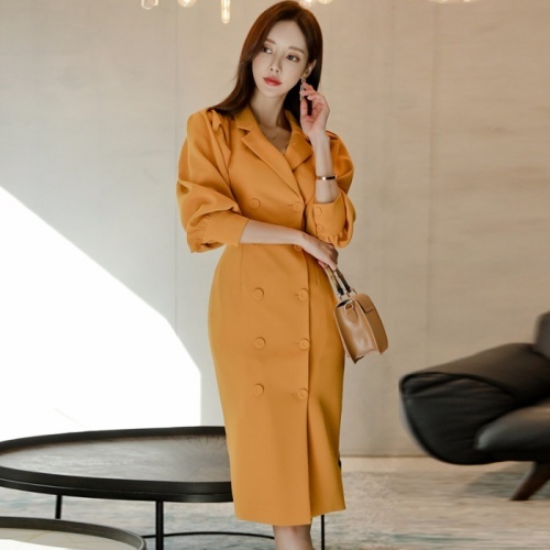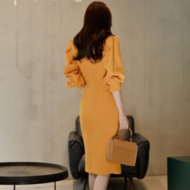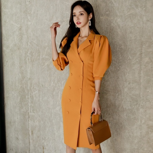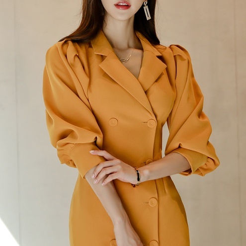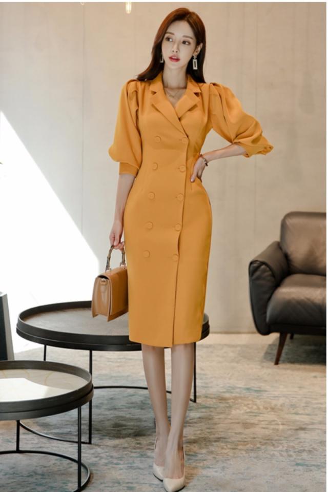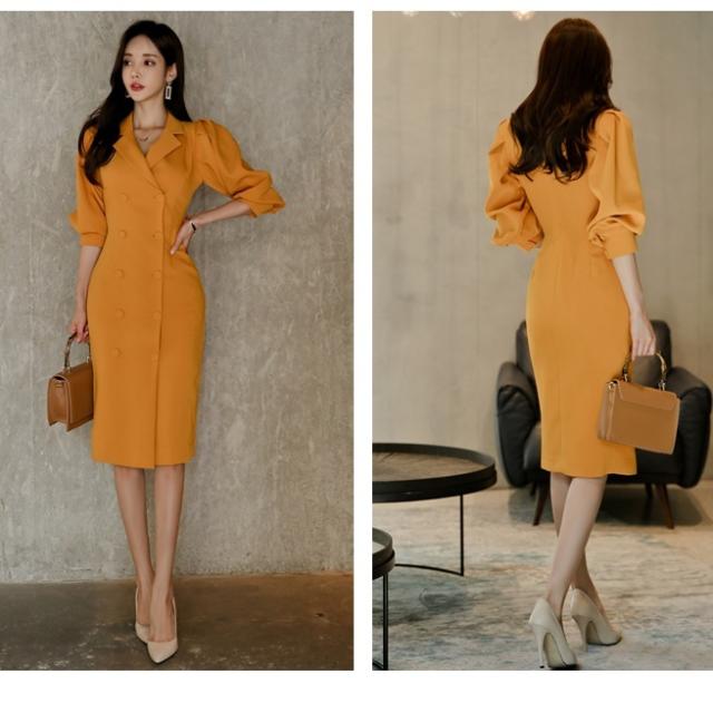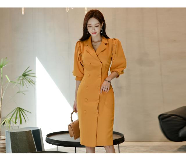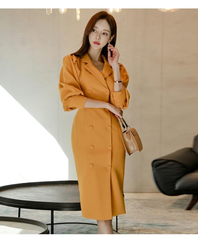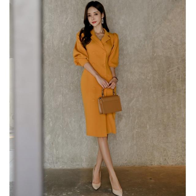 きれい色 ボリュームスリーブ ダブルボタン ワンピース レディース スーツライク ミディ丈 膝丈 ひざ下 五分袖 七部袖 パフスリーブ 襟付き テーラードカラー スリム タイト Iライン ダブルブレスト きれいめ シンプル 上品 おしゃれ 大人女子 エレガント 存在感 フェミニン