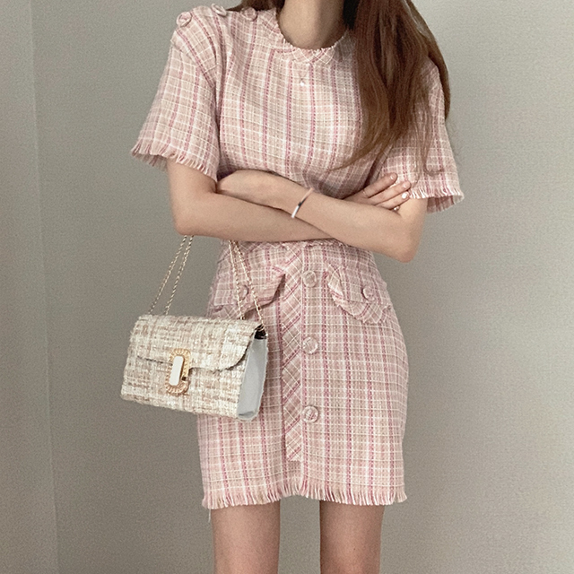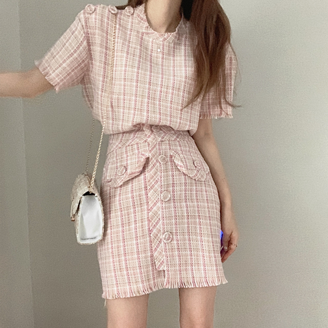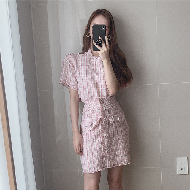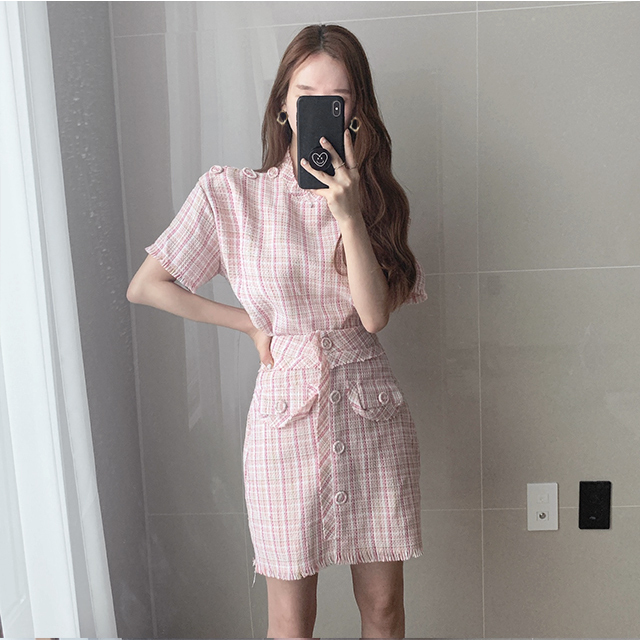 ツイードセットアップ セットアップ ブラウス タイトスカート ミニ ミニ丈 膝上 袖あり 半袖 ハイネック 襟付き スタンドカラー タイト Iライン 綿 上下セット 2点セット かわいい 大人可愛い きれいめ 上品 おしゃれ お洒落 大人可愛い 大人女子 ラブリー キュート 無地 春 夏 10代 20代 30代 レディース ビジネス OL 通勤 デート お出かけ 女子会 着回し 韓国 韓国系 オルチャン モテ 美脚 脚長 サイズ S M L 青 ブルー ピンク