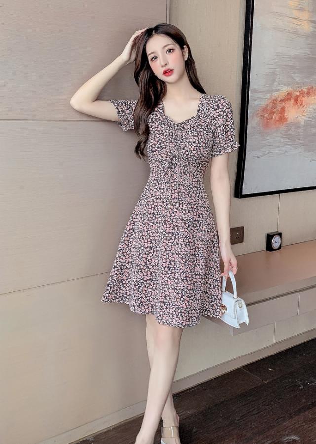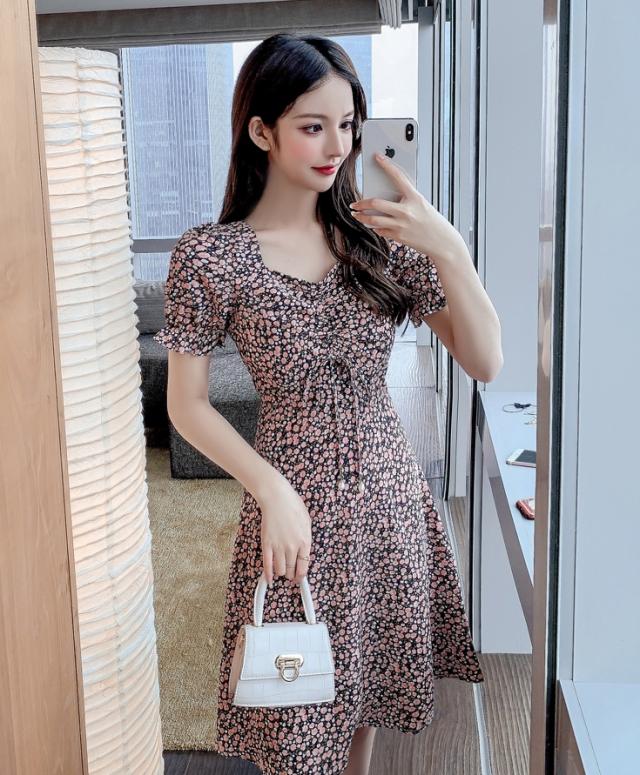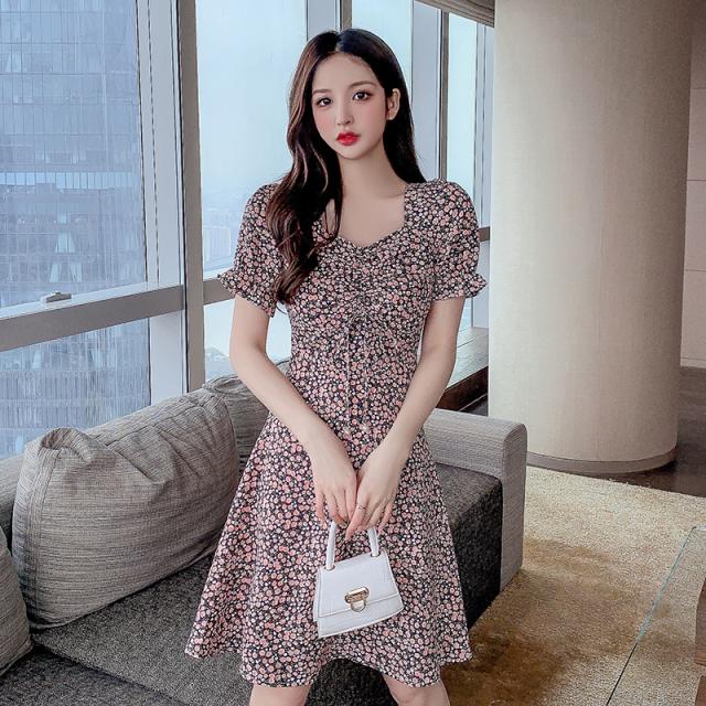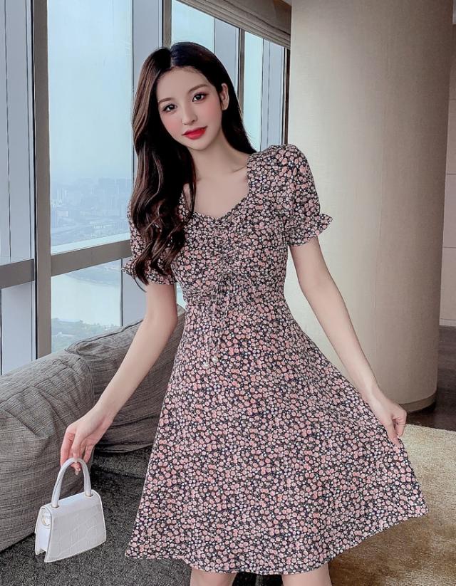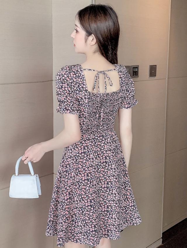 小花柄ワンピース ワンピ フラワー柄 ミニ ミディ丈 膝上 ひざ丈 ペンタゴンネック 半袖 パフスリーブ Aライン 袖口フリル シャーリング ドロストリボン バックネックリボン ハイウエスト シンプル カジュアル キュート ガーリー 大人 可愛い 春夏 脚長効果 デート 普段使い
