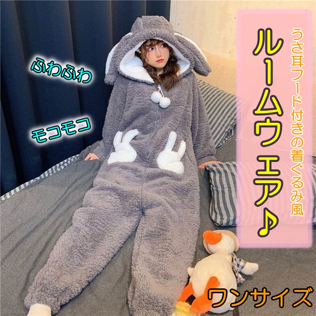 ルームウェア パジャマ もこもこ ふわふわ 部屋着 着ぐるみ つなぎ ワンピース オールインワン パンツ うさ耳 ナイトウェア ウサギ ラビット うさぎ かわいい 可愛い 暖かい あったか 長袖 袖あり ボア モコモコ ぽんぽん ロング ロング丈 ポケット 前開き ジッパー ファスナー フード付き 厚手 カジュアル コスプレ 着る毛布 ラブリー キュート 主役級 存在感 お泊り デート 学生 旅行 休日 普段使い レディース 10代 20代 秋 冬 ワンサイズ ダークグレー 灰色