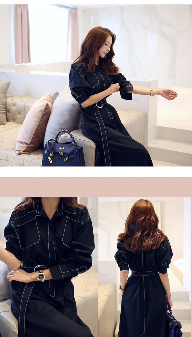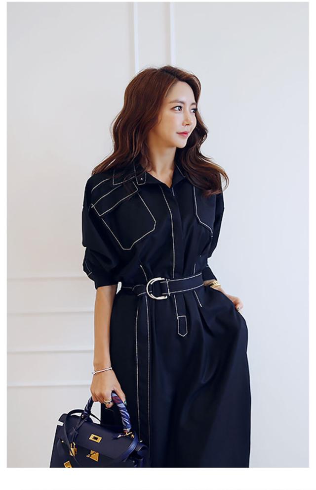 ステッチシャツワンピース ワンピース シャツワンピース ロング ロング丈 袖あり 長袖 Vネック 襟付き スリム 細身 Iライン ベルト ウエストマーク ハイウエスト かわいい 大人可愛い シンプル カジュアル 大人 おしゃれ お洒落 大人可愛い 大人女子 こなれ感 ボーイッシュ クール 主役級 存在感 無地 春 夏 秋 10代 20代 30代 レディース 学生 通学 デート お出かけ 女子会 休日 着回し 普段使い 韓国 韓国系 サイズ S M L XL 色展開 黒 ブラック カーキ