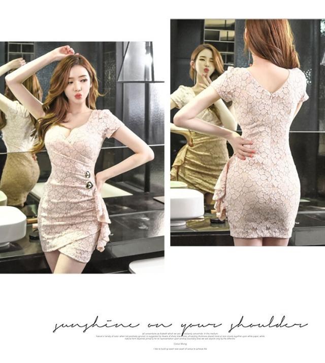 レースワンピース ドレス ワンピ マイクロミニ ミニ丈 膝上 タイト 透け感 半袖 Vネック スリムフィット ボディコンシャス 谷間見せ ウエストタック ラップ風 チューリップスカート シンプル 大人 セクシー 肌見せ 色っぽい フェミニン 攻め服 キャバ イベント パーティー