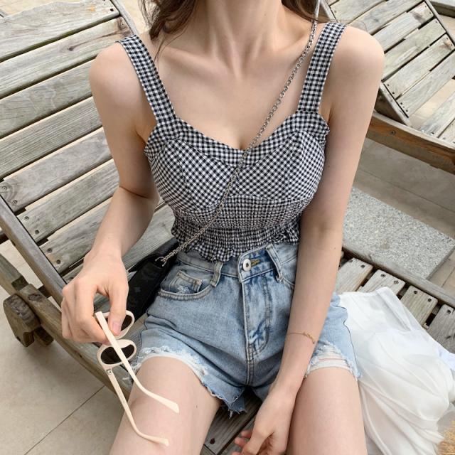 ギンガムチェックビスチェ トップス キャミソール ショート ショート丈 袖なし ノースリーブ タイト 細身 フリル かわいい 大人可愛い シンプル カジュアル おしゃれ お洒落 大人可愛い 大人女子 ラブリー キュート ガーリー チェック柄 春 夏 10代 20代 30代 レディース 学生 通学 デート お出かけ 公園デビュー 休日 着回し 普段使い 重ね着 韓国 韓国系 サイズ S M L 黒 ブラック