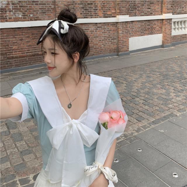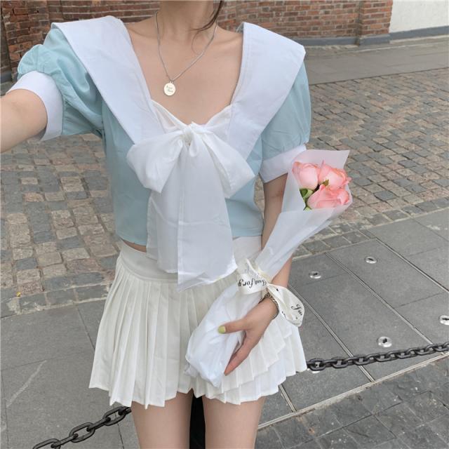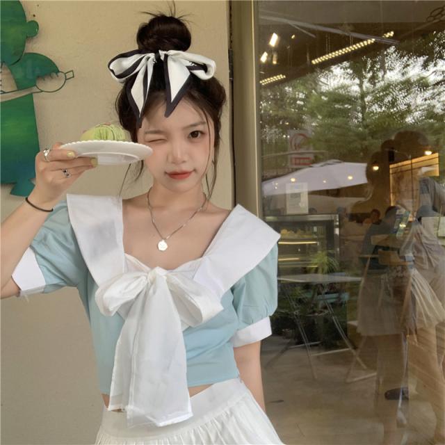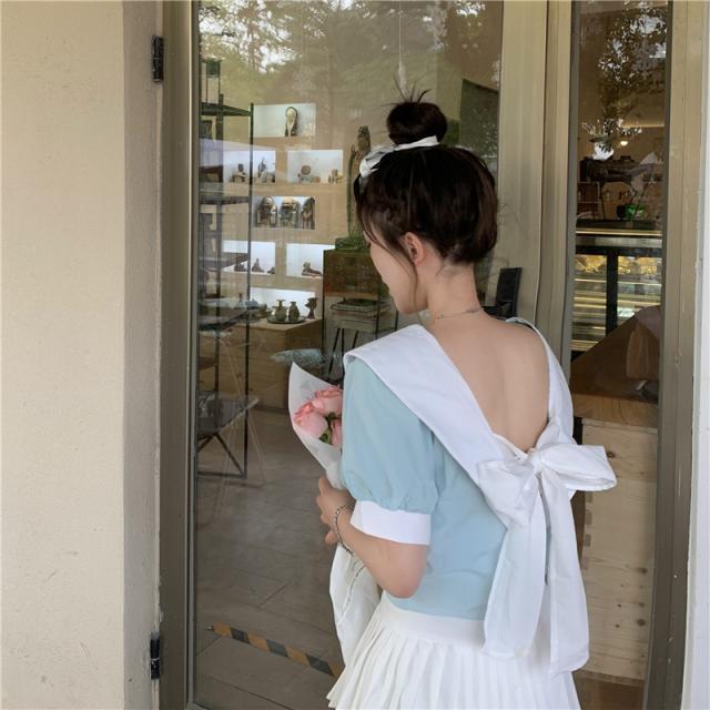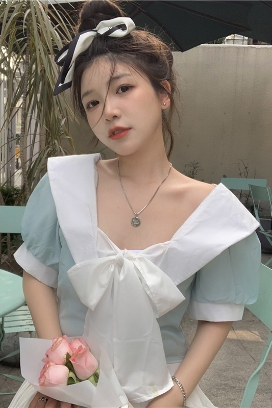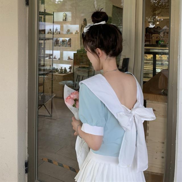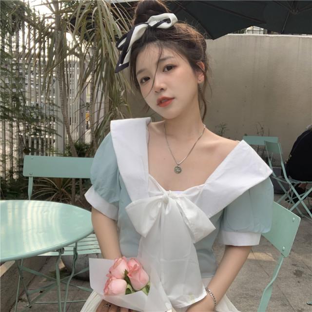 フロントリボンバイカラーブラウス トップス ブラウス ショート ショート丈 袖あり 半袖 パフスリーブ Vネック リボン バックシャン かわいい 大人可愛い シンプル おしゃれ お洒落 大人可愛い ラブリー キュート ガーリー 個性的 主役級 無地 春 夏 10代 20代 30代 レディース 学生 通学 デート お出かけ 女子会 休日 着回し 普段使い 韓国 韓国系 色展開 黒 ブラック 青 ブルー