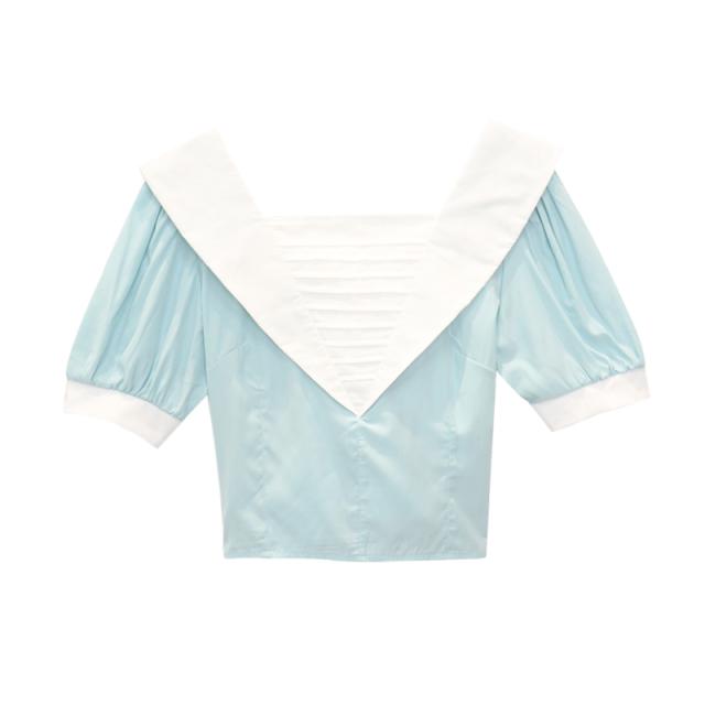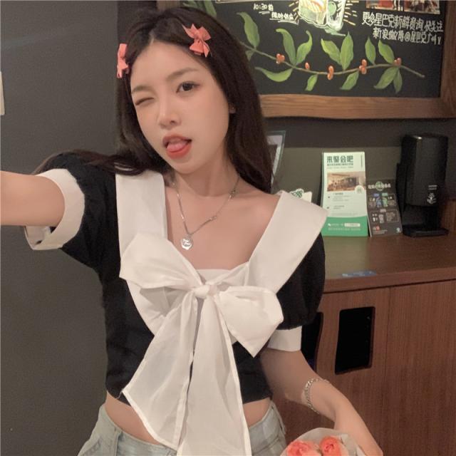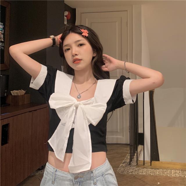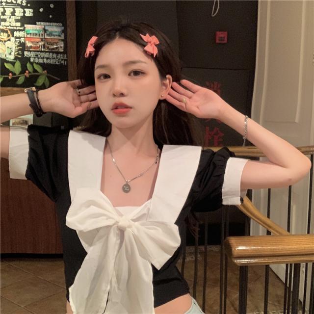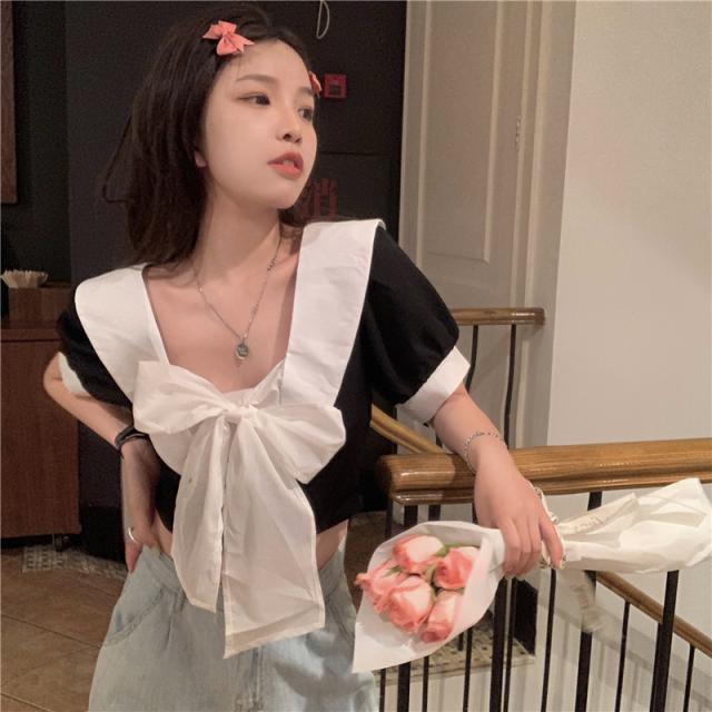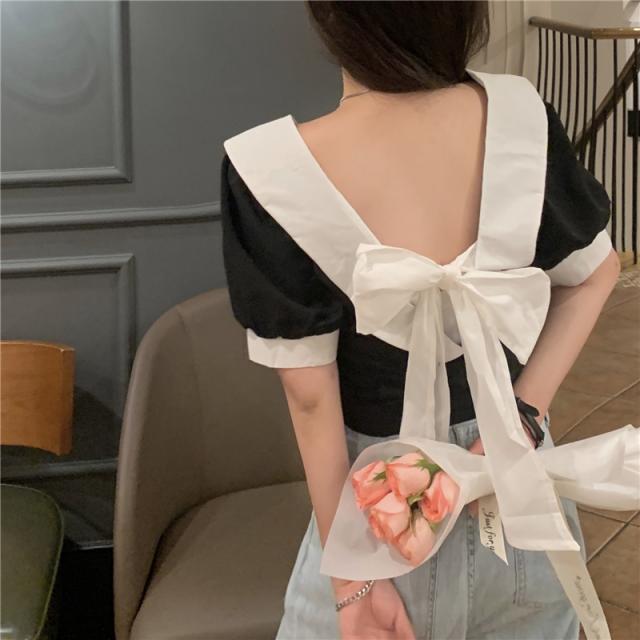 ブラウス 半袖 白 黒 春 夏 秋 トップス レディース ショート丈 フロント リボン バイカラー パフスリーブ Vネック バックシャン カジュアル セクシー 可愛い シンプル おしゃれ 個性的 ラブリー 重ね着 おうち時間 デート お出かけ 女子会 OL 学生 大学生 通学 通勤 2色展開